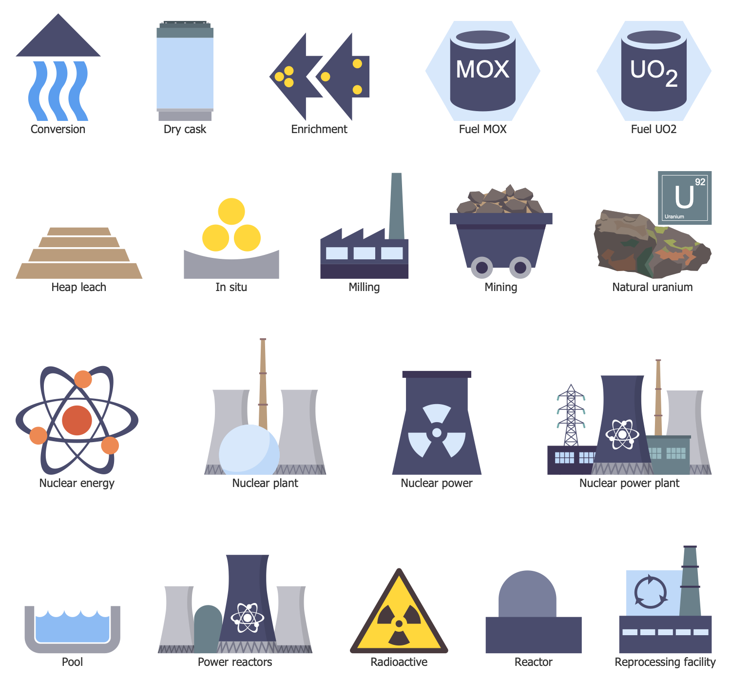 Energy Industry Infographics solution is a powerful solution for developing business infographics, charts, diagrams, illustrations for documents and energy-related presentations. This solution provides a set of libraries with special vector energy industry symbols, icons for electrical power industry, nuclear power industry, fossil fuel industry, and renewable energy industry. It includes energy icons of fuel gas, liquid fuel, solid fuel, industry icons of electrical substations, power plants, and collection of samples for quick start drawing using ConceptDraw DIAGRAM software. Nuclear fuel cycle and energy distribution schematics, electrical substation diagram, energy intelligence dashboard, electricity grid schematics, and many more samples are included. This solution is indispensable for all engineers, chefs, managers, marketers, and other professionals working in energy industry.