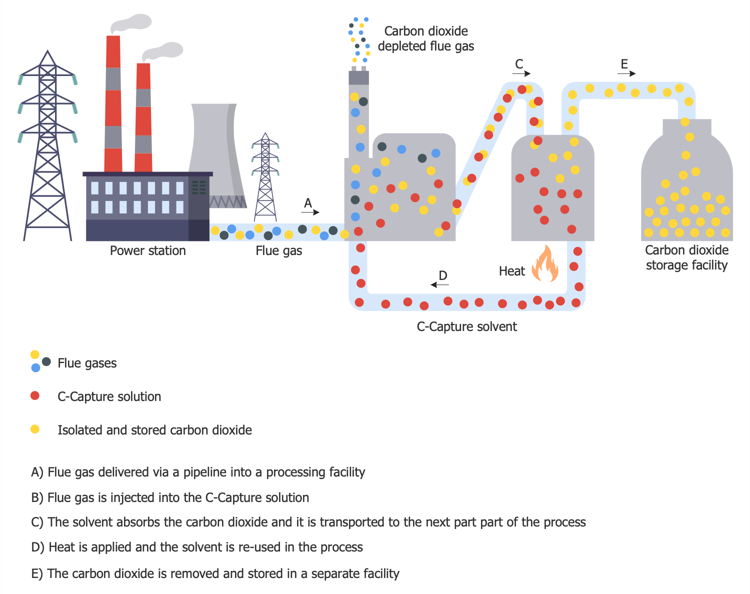 This sample shows a pilot scheme Bio Energy with Carbon Capture and Storage (BECCS) developed by Drax Power Limited Company for the Drax power station. It illustrates the capturing and storing carbon dioxide emissions. Drax power station is a biomass and coal-fired power station opened in 1974 on the River Ouse in North Yorkshire, England. It has the highest power among the power stations in the United Kingdom, 2.6 GW capacity for biomass and 1.29 GW capacity for coal. Gradually from 2016 the coal units of this station stop burning coal and are converted to biomass firing according to the government's program of banning all coal-fired electricity in the United Kingdom. The launch of a carbon capture and storage pilot scheme was announced in 2018. This scheme is based on capturing carbon from biomass burners after combustion. The flue gas is delivered to the processing unit and injected into the C-Capture solution. Carbon dioxide is absorbed by the C-Capture solvent. After further heating, the solvent is reused, the carbon dioxide is removed, transferred to a separate storage facility and stored there.