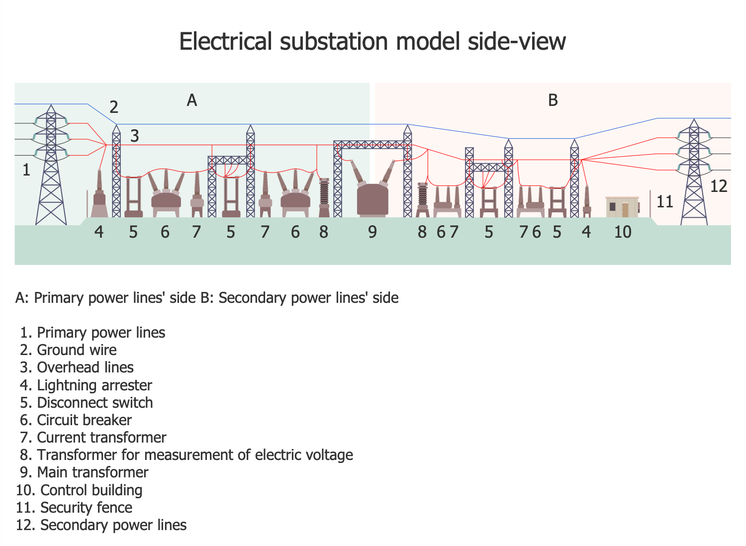 Electrical substation is an electrical system with a high-voltage capacity, it transforms voltage from high to low and in reverse. Electrical substations are a part of the electrical generation, transmission, and distribution system. They control the work of generators, electrical circuits, and other equipment. They are the transmitting and distributing stations, receive energy from a larger plant and then distribute it to end consumers. On the way from the generating station to the consumer, electric power may flow through several substations. As their voltage may differ, the transformers are used and change voltage. This sample of electrical substation diagram shows a side view of a model electrical substation. Sector A is the primary transmission line side and sector B includes the secondary transmission line side. The structure includes the following elements: primary power lines, ground wire, overhead lines, lightning arrester, disconnect switch, circuit breaker, current transformer, voltage measuring transformer, main transformer, control building, security fence, and secondary power lines.