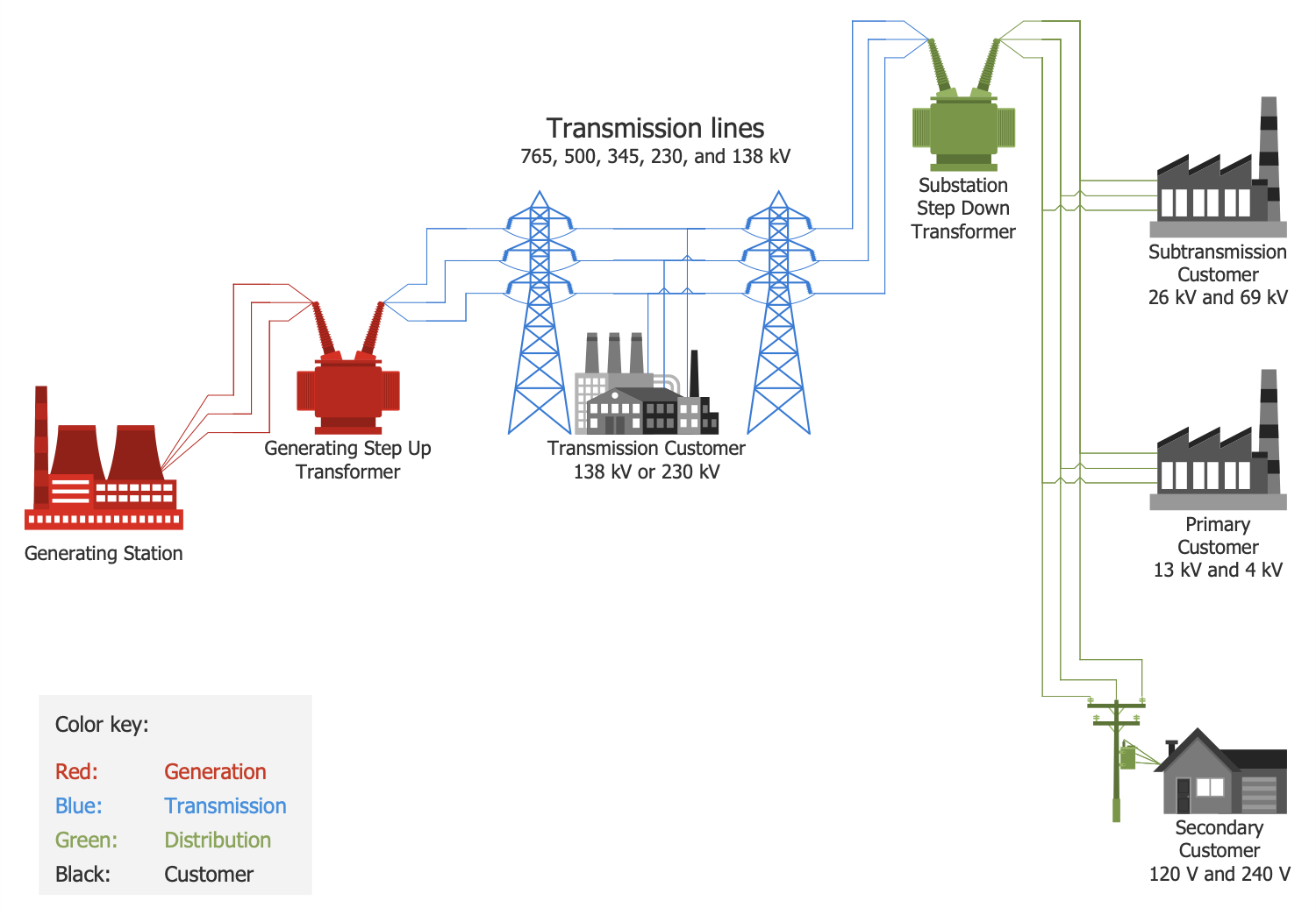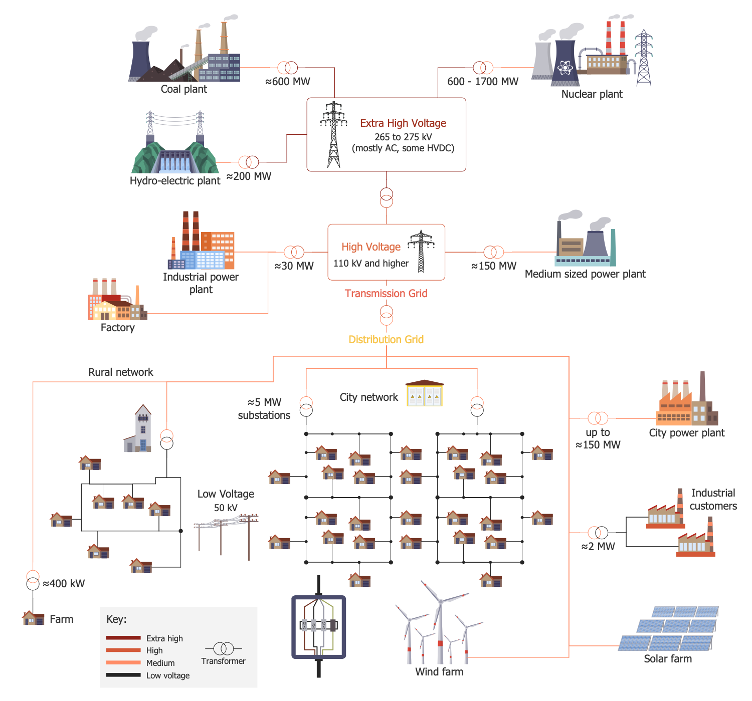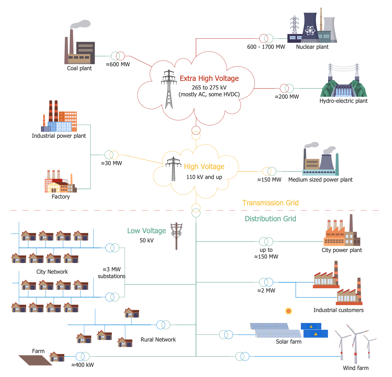 This sample shows a schema of an electricity grid. It is an interconnected network used for electricity delivery from a power station to consumers. Electrical grids can significantly vary in size of covered territory and be supplied with different equipment. The transformers are used to step voltage down from high to medium and from medium to low. Ultra-high voltage is classified in the range from 275 to 765 kV, high voltage ranges from 110 kV and above, and low voltage ranges from 5 to 50 kV. On the way from electrical substations to enterprises and residential houses, the voltage is also reduced by means of transformers. They allow stepping voltage down to service voltage of lighting, household appliances, and industrial equipment. Power of required voltage enters to production plants like nuclear, coal, hydroelectric, industrial power plants, medium-size power plants and factories, and to small commercial enterprises and residential consumers. The details on the transmission and distribution of generated electricity are shown in a visual form by means of powerful Energy Industry Infographics solution tools and ready-made energy industry icons.