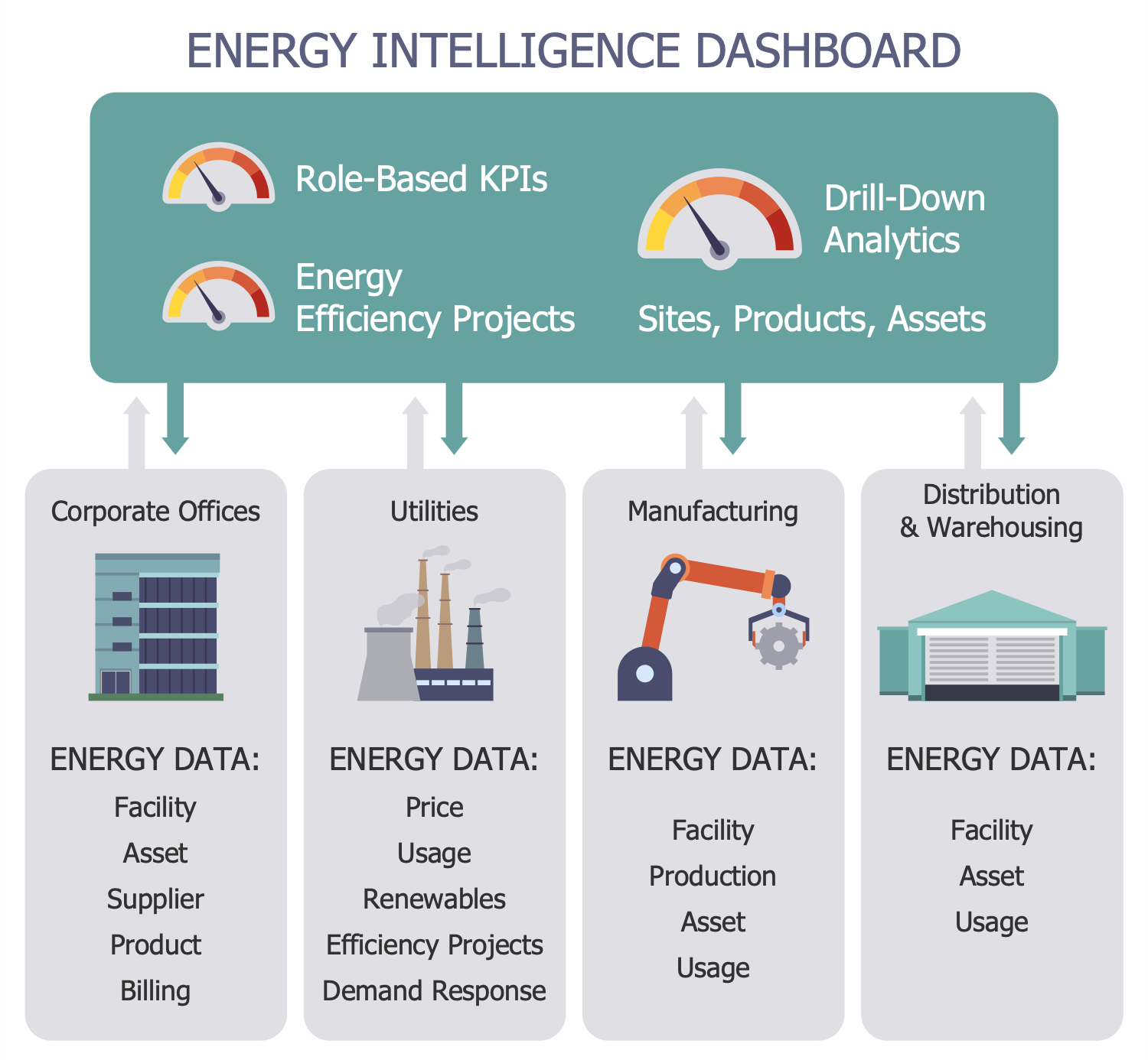 This infographic sample shows an energy intelligence dashboard. Plant managers, executives, and other stakeholders use similar dashboards in energy management. They are helpful to quickly analyze and monitor real-time energy data. Energy management includes a lot of actions. It is directed at the optimization of energy efficiency, ensuring permanent energy access for consumers. Energy management allows you to reduce the cost of supply and distribution of energy to facilities, saves resources and protects the environment. Most of the total operating costs of any facility are energy costs, so facility management is an important part of energy management. Sometimes changing the energy source for an object can be a profitable and environmentally friendly solution. Solar-powered passive houses have minimal energy losses and are relevant. Buildings generating energy and homes generating more energy than they import from external sources are also efficient solutions.