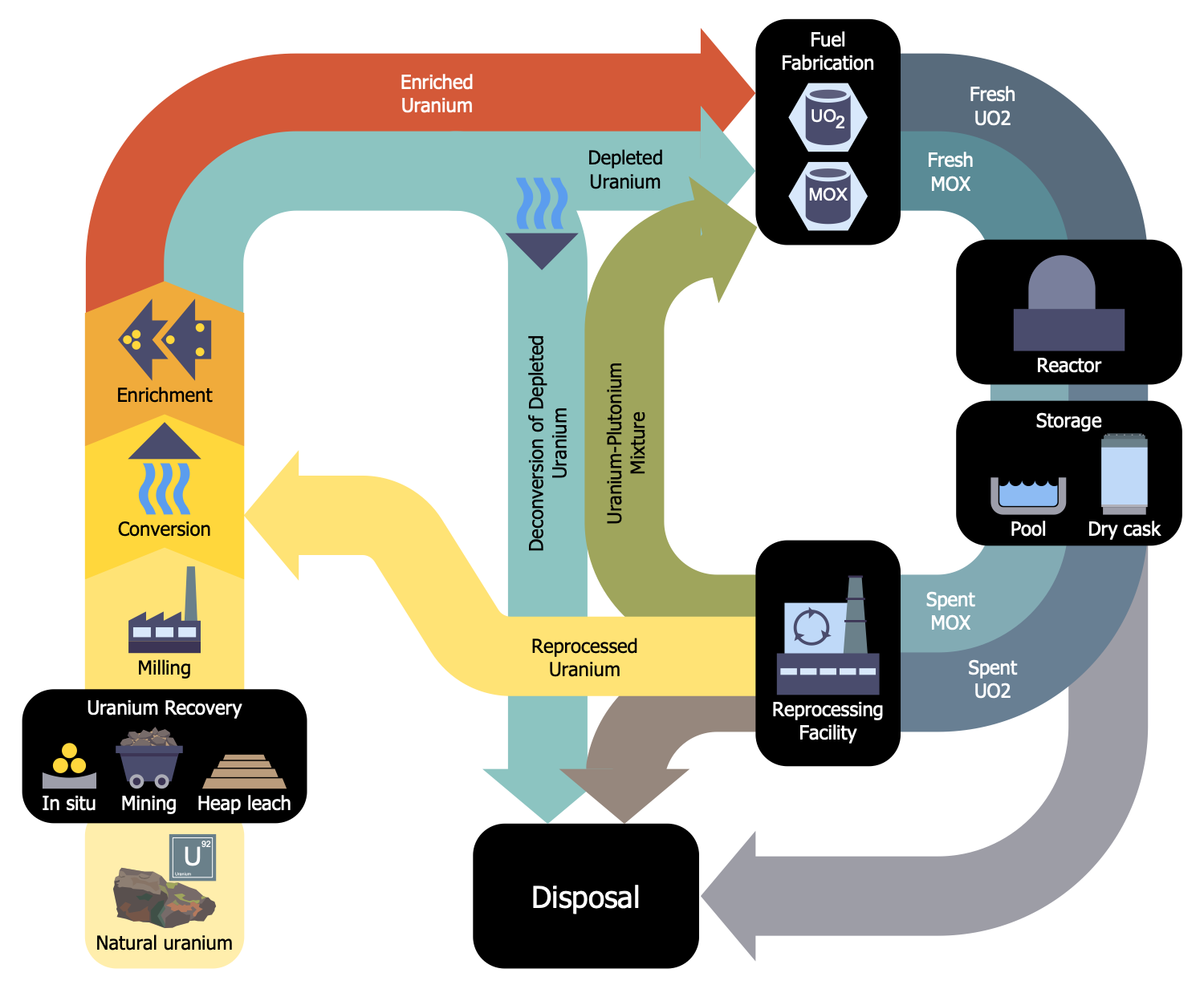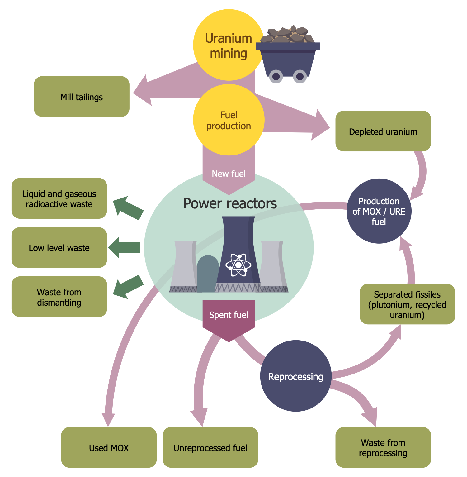This sample shows a scheme of nuclear waste and nuclear fuel cycle. This cycle includes all processes connected with nuclear fuel used in nuclear power stations to produce heat. The cycle begins from nuclear fuel mining and includes refining, purifying, using, and disposing of nuclear fuel. Heat is generated by nuclear fission by the actinide elements contained in nuclear fuel. Uranium-233, uranium-235 and plutonium-239 are the most suitable fissile isotopes. A nuclear reaction occurs as a result of a slow neutron hitting the unstable nuclei of an atom of one of the listed elements. The nucleus splits into two daughter nuclei and two or three neutrons. Then these neutrons fission more nuclei again. A self-sustaining chain reaction occurs. But there are other types of nuclear fuel. For example, for plutonium-238 is used a radioactive decay in radioisotope thermoelectric generators. As for the alternative to low enriched uranium fuel, it is a mixed oxide (MOX) fuel. MOX is a blend of plutonium and natural or depleted uranium and behaves similarly uranium fuel in nuclear reactions.