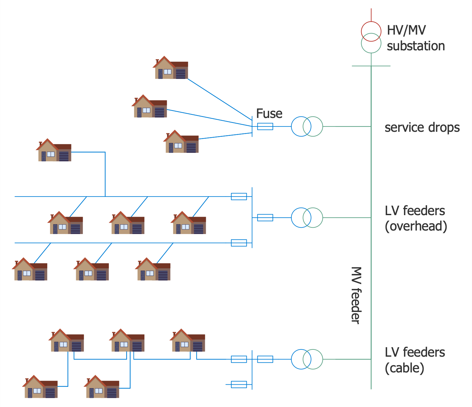 This sample demonstrates a layout of a typical European electric distribution system. It is a scheme of a low-voltage network. A network of this type is a part of an electric power distribution system; it delivers electric energy from distribution transformers to end users. Energy is distributed from the V / MV and MV / LV substations along radial circuits called feeders. They form a medium voltage network. Distribution transformers are located along feeders connected by a parallel bus or collector bus. They move the voltage from medium to low. This low voltage energy is delivered to end users. The voltage of low-voltage networks is equal to the operating voltage of electrical appliances. Voltage 220-240V is mainly used in Europe. European transformers can cover large areas. In rural areas, single-phase transformers are used. Urban networks are served by three-phase transformers. The use of fuses or local circuit breakers avoids the failure of the entire network, only the damaged part can temporarily lose its functionality.