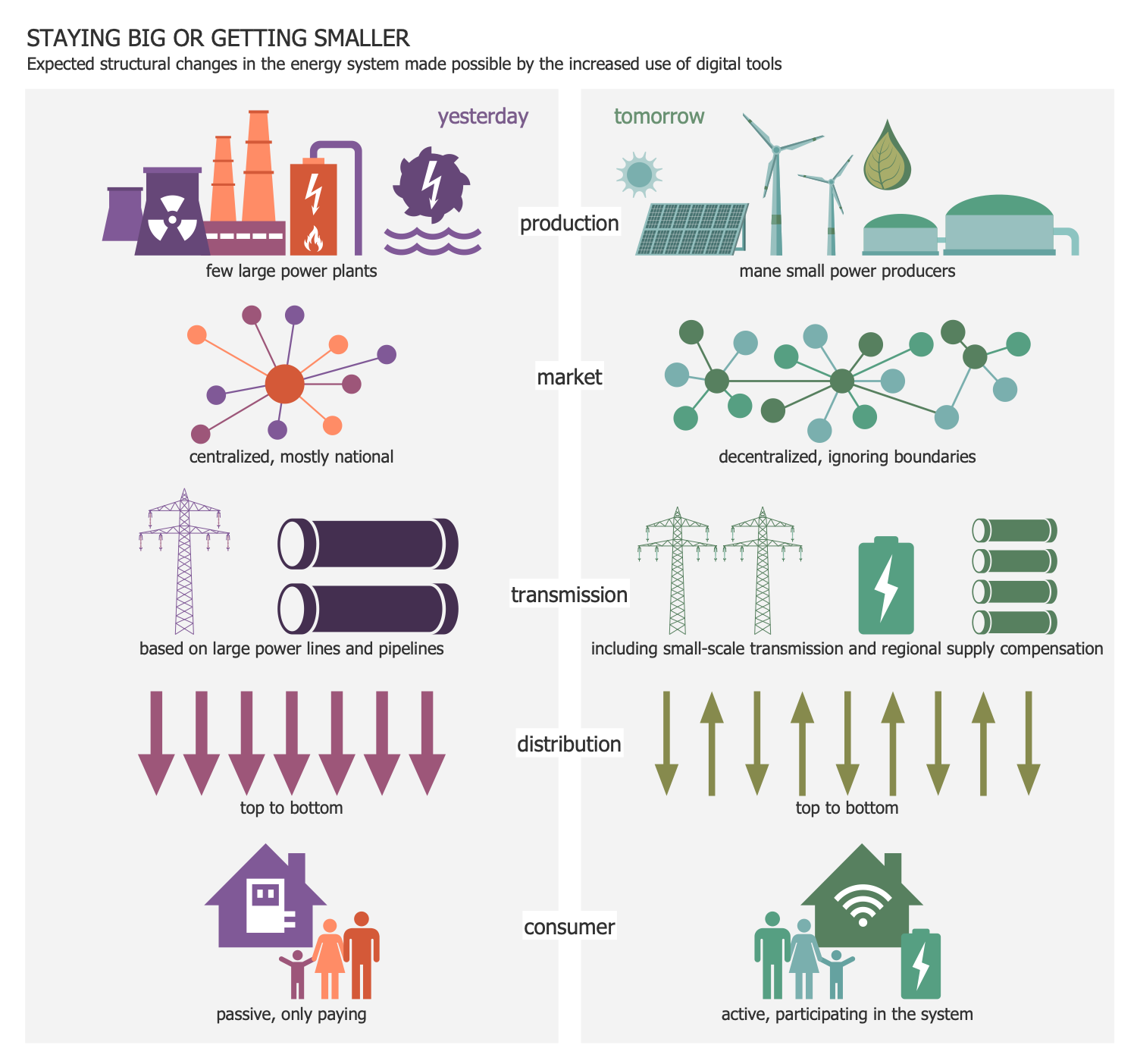 This sample compares a traditional electrical system and a smart grid. All the characteristics of the traditional system are presented on the left side of the diagram, and the characteristics of the smart grid are on the right. All structural changes in the energy system are a result of the use of modern technologies and digital tools. A smart grid is a type of electrical grid including a variety of intelligent or "smart" equipment and appliances. All processes related to the control of the production and distribution of electricity are implemented by electronic equipment in the smart grid. It includes advanced metering infrastructure, smart distribution boards, load control switches, circuit breakers integrated with home control, energy-efficient resources, and renewable energy resources. The components are connected using sufficient broadband fiber optic cable. One of the main differences between these two systems is the active participation of consumers in the work of the system. They usually use renewable energy sources instead of passive paid electricity consumption.
