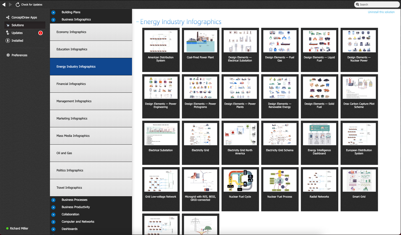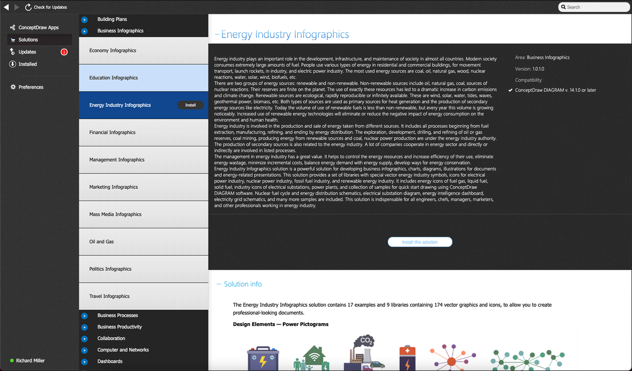 After ConceptDraw DIAGRAM is installed, the Energy Industry Infographics solution can be purchased either from the Business Infographics area of ConceptDraw STORE itself or from our online store. Thus, you will be able to use the Energy Industry Infographics solution straight after.