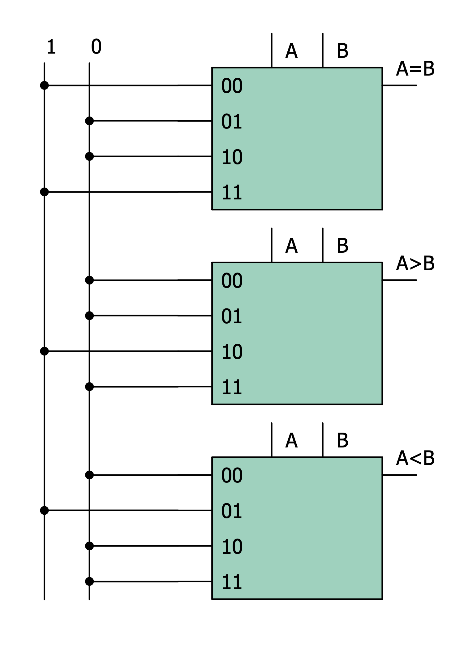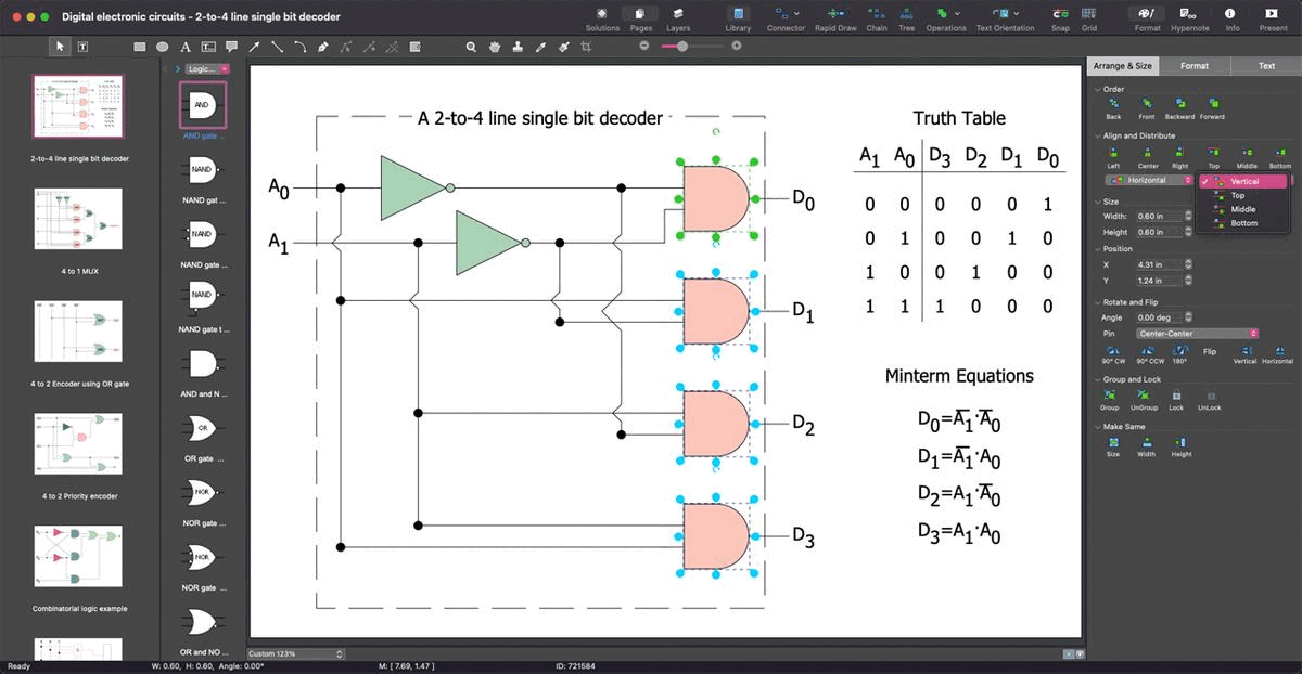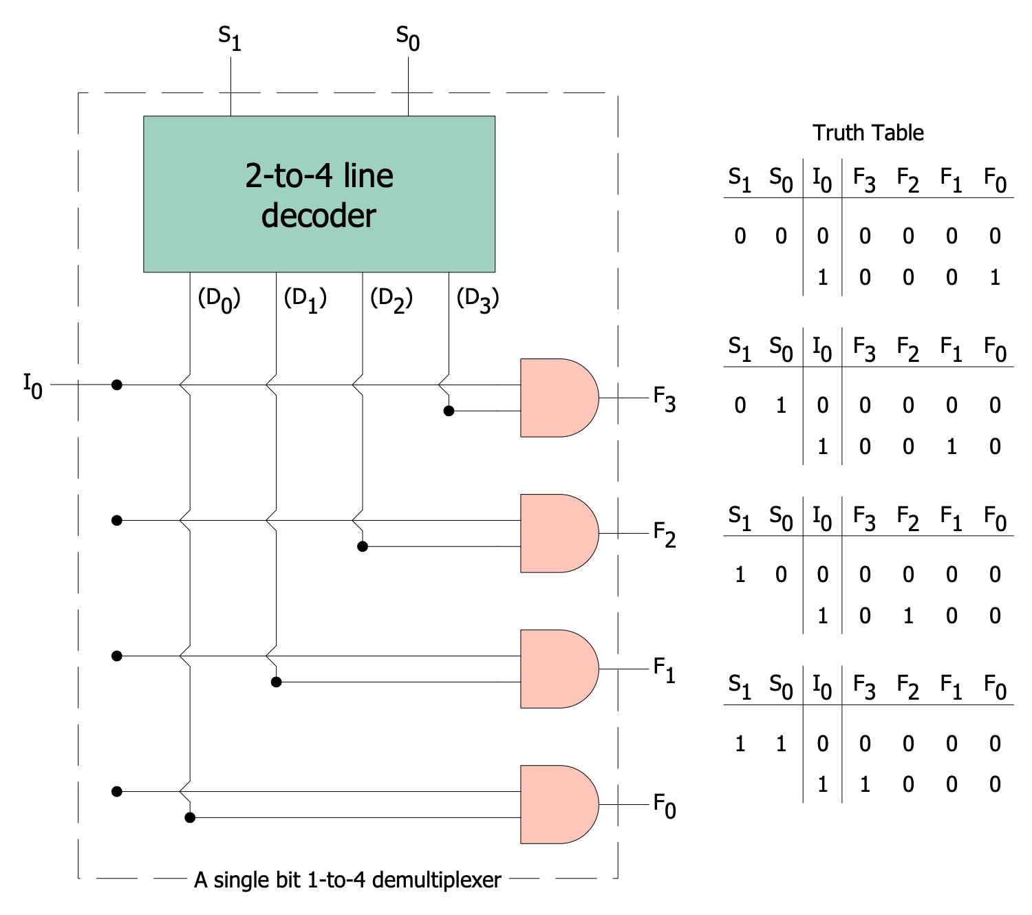 This digital electronic circuit diagram example shows a 2-to-4 line single bit decoder with a truth table and minterm equations. A binary decoder is an electronic circuit with combinational logic. It includes multiple coded inputs and multiple outputs. A primary purpose is to convert binary information from the n input signals to 2n unique output signals. When a decoder has less than 2n outputs, at least one output will be the same for different input values. As a rule, the data inputs of the binary decoders are integers. As for the implementation, a binary decoder is designed in one of two ways: as a stand-alone integrated circuit (IC) or as part of a complex IC. A binary decoder has a wide variety of applications and is mainly applied in the form of the standardized IC. Common applications include data multiplexing, data demultiplexing, instruction decoding, memory address decoding, and more.