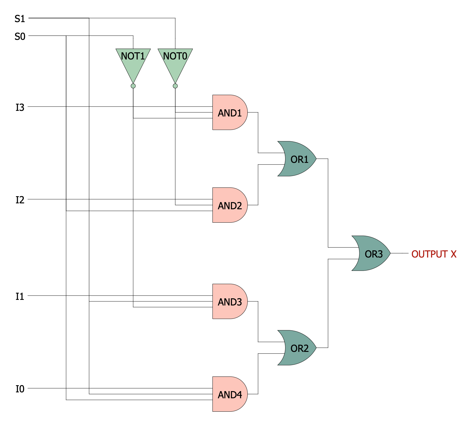 This digital electronic logic diagram example shows a 4 to 1 multiplexer (MUX) using 4 inputs AND, 3 inputs OR, 2 NOT gates. The inputs are shown as I0, I1, I2, I3; the output X depends on the selector lines S0 and S1. A multiplexer selects a single input signal among several analog or digital signals and sends it to a single output line. That is why it is also called data selector. This selection is made using selector lines, which are a separate set of digital inputs. A multiplexer with 2n inputs has n selector lines. In this regard, an electronic multiplexer is often considered as a multiple-input rotary switch or single-output switch. Digital multiplexers are constructed from high-speed logic gates. Analog multiplexers use transistors, MOSFET’s or relays. In this case, different inputs can share the same device or resource. Often, multiplexers are used to implement Boolean functions with multiple variables.