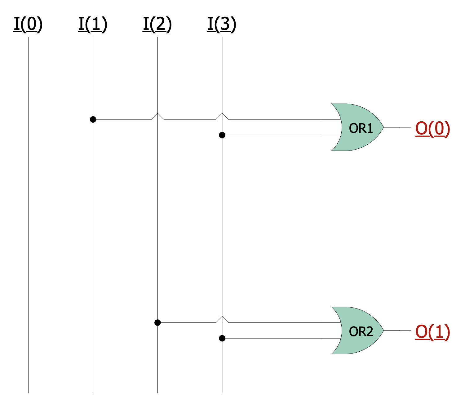This digital electronics diagram example shows a single bit 4 to 2 priority encoder. It is a circuit or algorithm used to compress multiple binary inputs into outputs, at this the number of outputs is smaller than inputs. It allows handling the multifarious input configurations. The output has a binary representation, starts from zero, and presents the index of the most significant of the activated lines. Often priority decoders are used to manage interrupt requests. Of two or more inputs, the one with the highest priority will take precedence. The priority decoder will act on this highest priority input. The inputs I0, I1, I2, I3 are shown in a diagram. Some of them will have an irrelevant value — their input value will be replaced by the value of the highest-priority input. The output V reveals if the input is valid. Sometimes, the priority encoders are connected in arrays and form larger encoders.