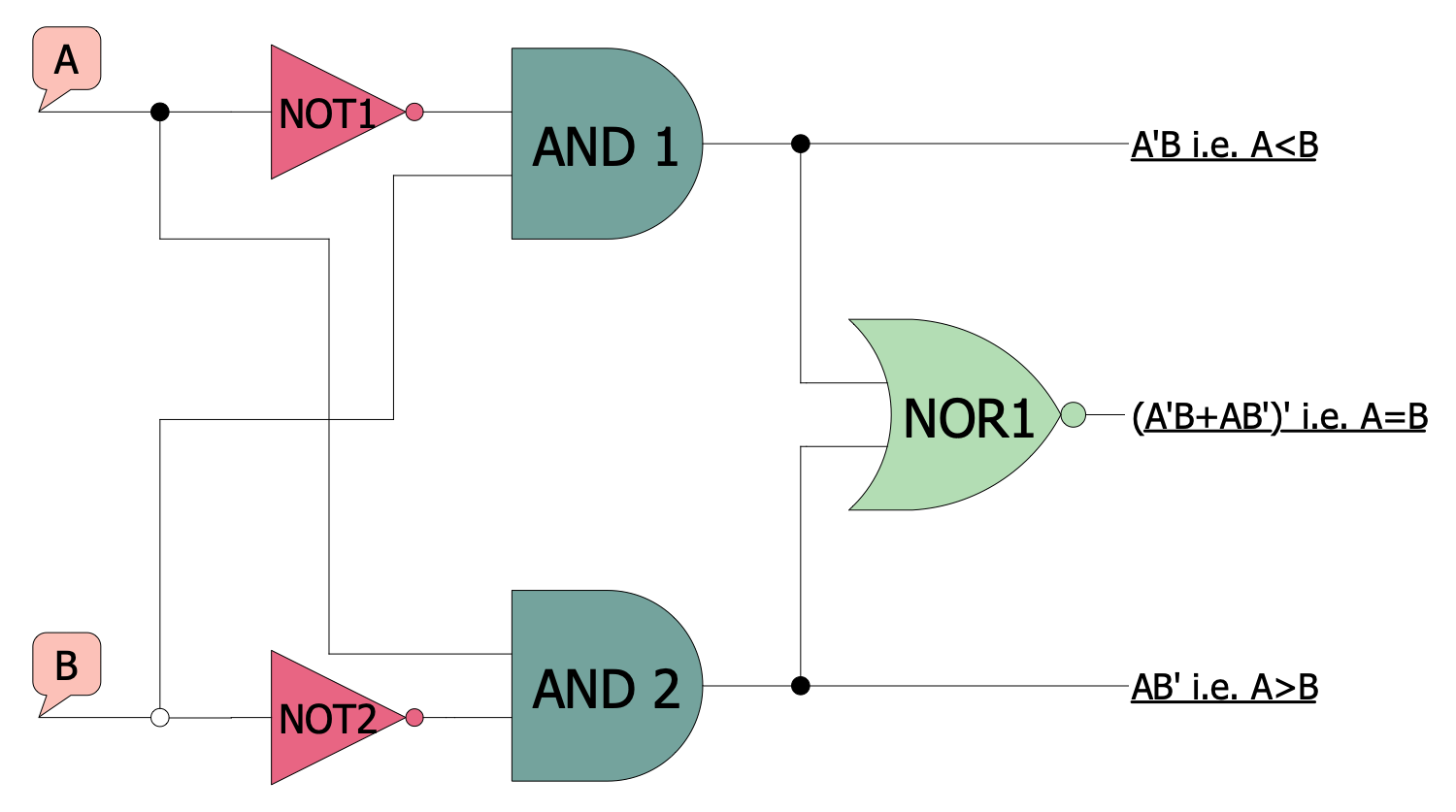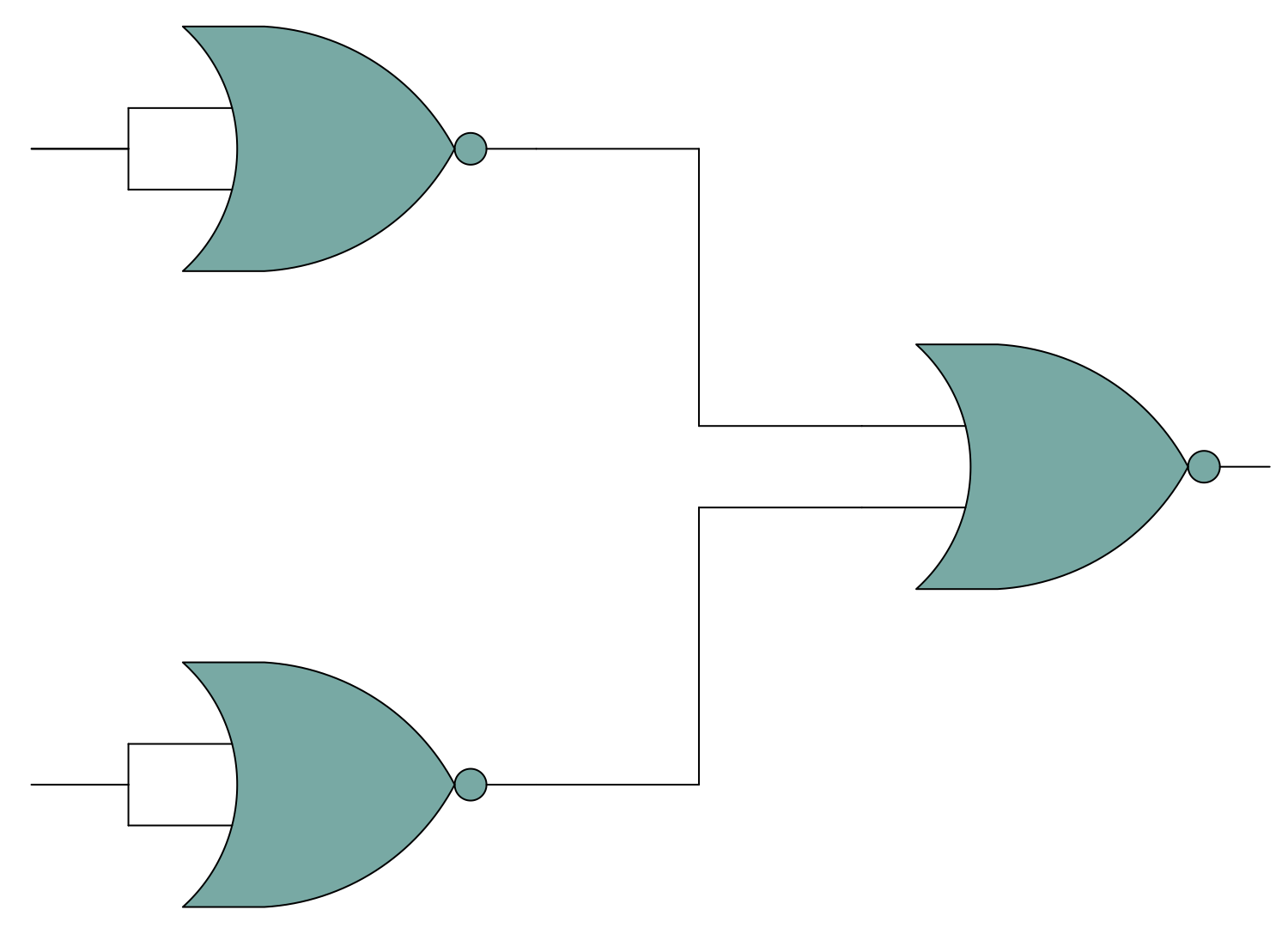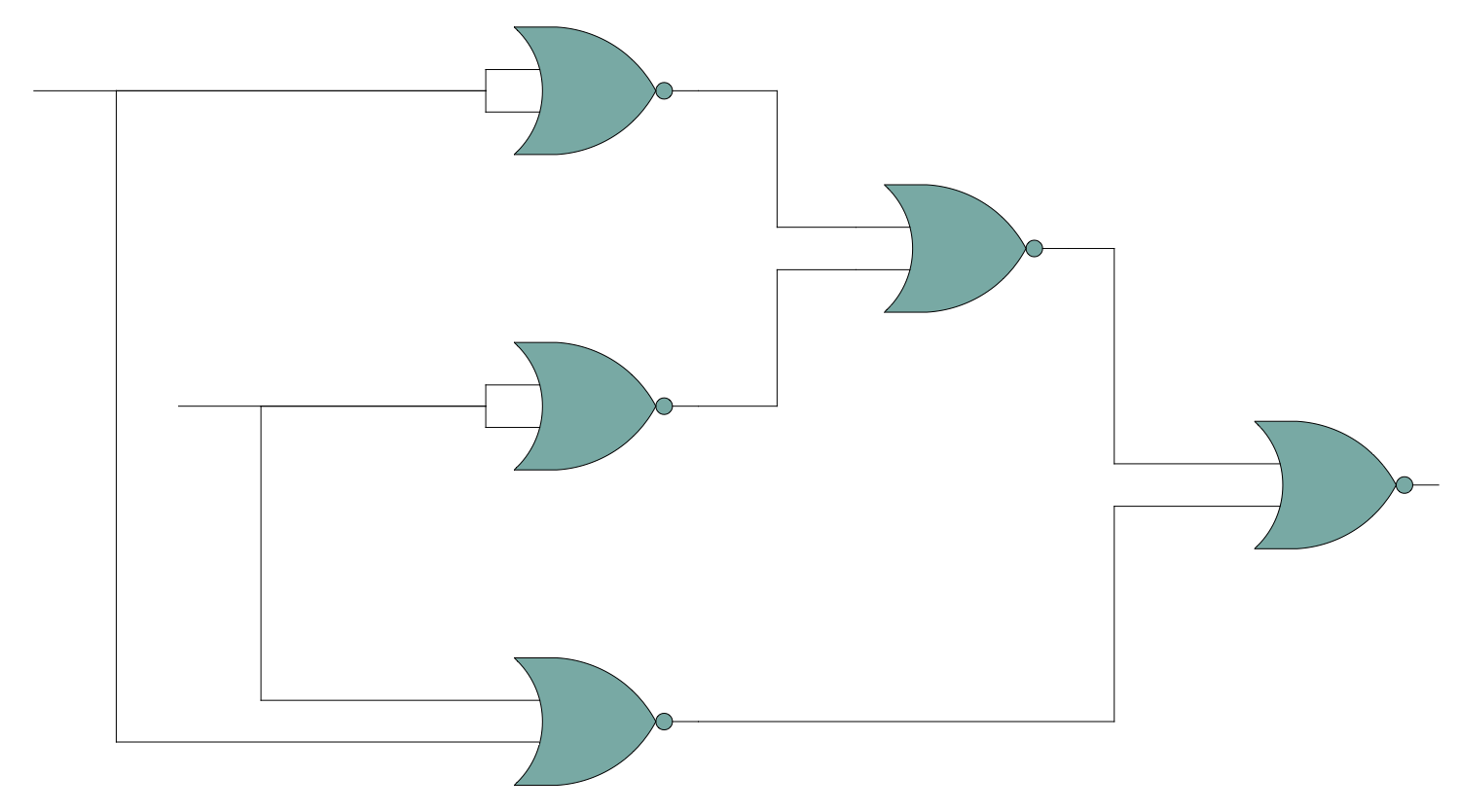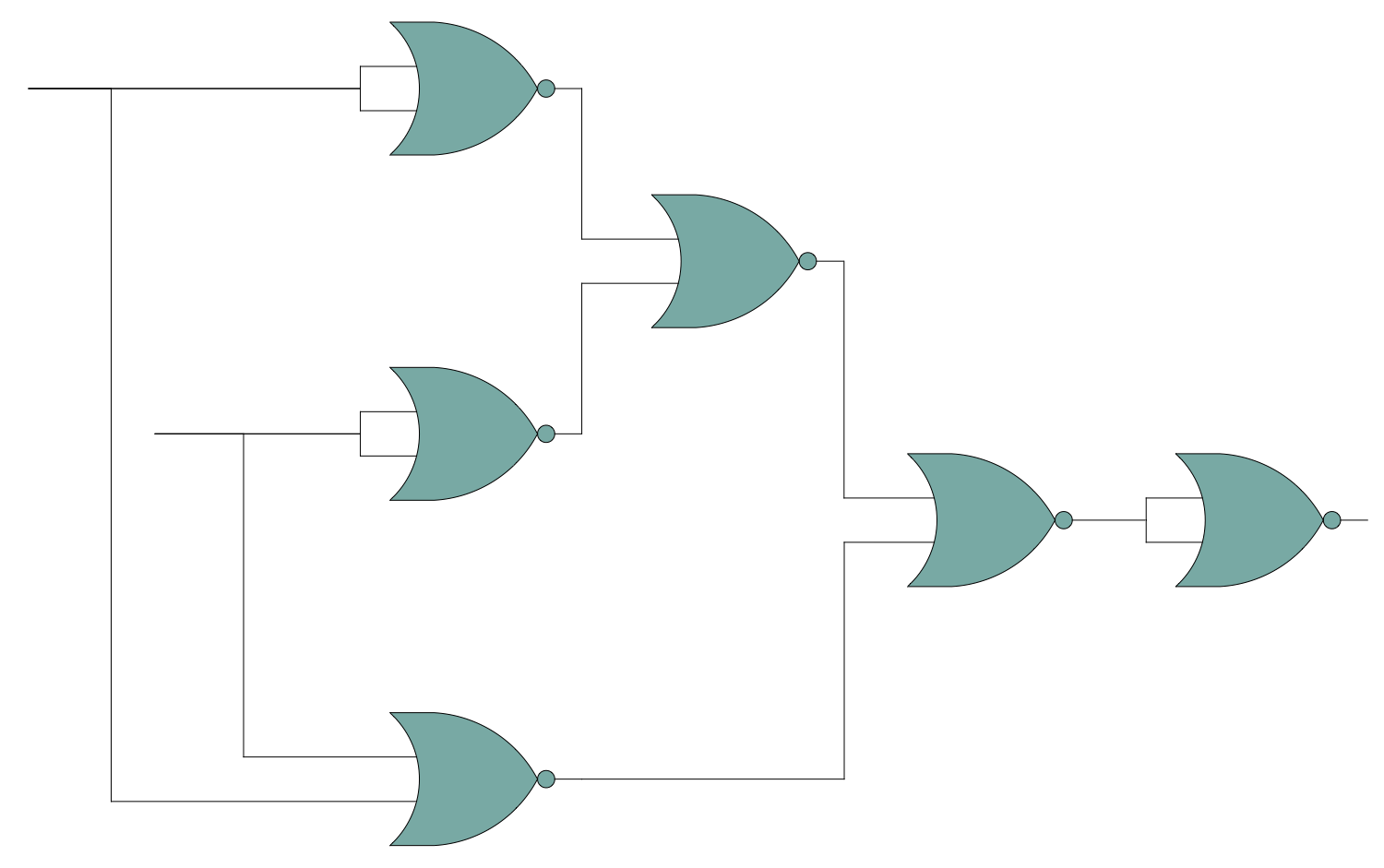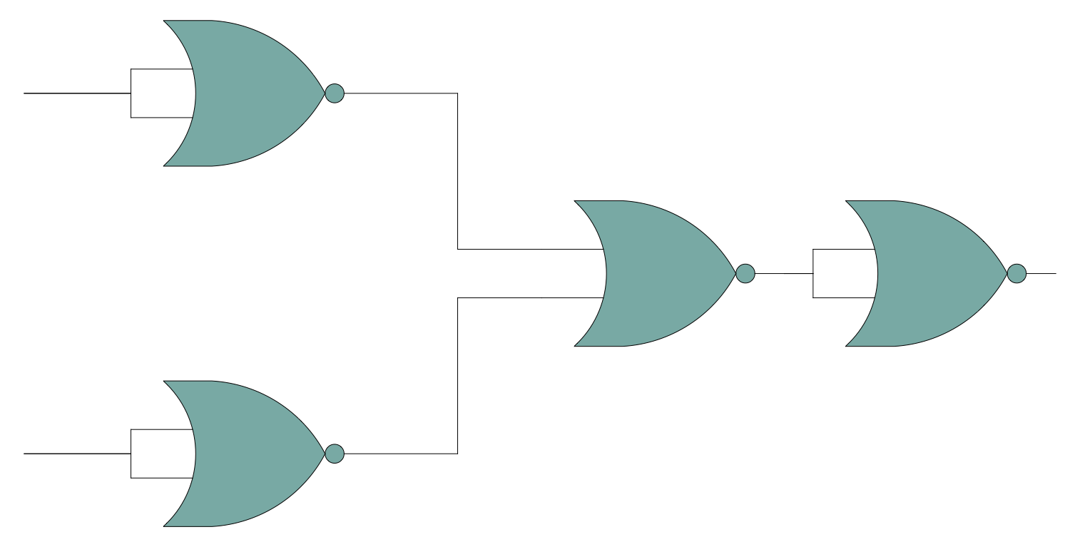 This digital electronic diagram shows an example of a logic circuit containing XOR, NAND, and NOR gates. They are used to construct both simple and complicated logic circuits. The different types of gates are connected to produce complicated switching circuits. A logic gate is an idealized model of a physical electronic device or computing device. It has one or more binary inputs, produces a single binary output, and uses logical operations or Boolean functions. As a rule, logic gates are constructed using diodes or transistors and act as electronic switches. It is an example of the combinational logic circuit and the output depends on the inputs. Moreover, any changes in input signals cause changes in the output. The vacuum tubes, pneumatic logic, optics, fluidic logic, electromagnetic relays, multiplexers, registers, microprocessors, and more elements are also used to build the logic gates. Today most gates are constructed of the metal–oxide–semiconductor field-effect transistors (MOSFETs). Here, the logic gates are shown using the predesigned logic gate symbols from the solution libraries.