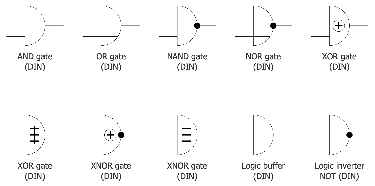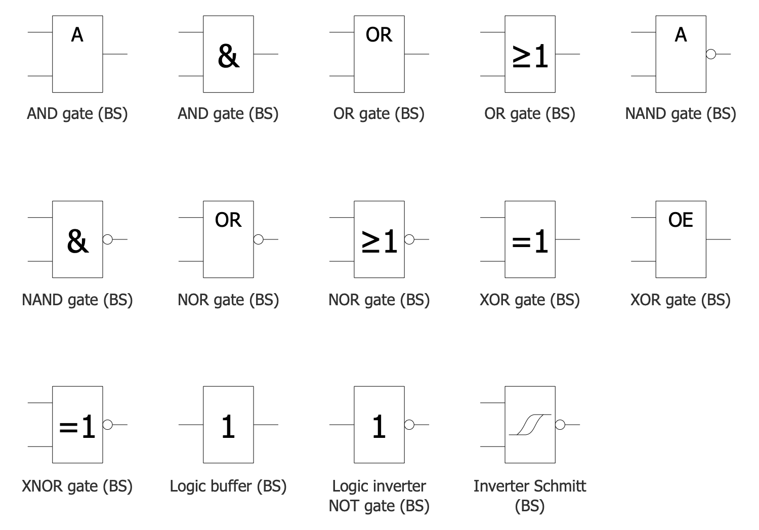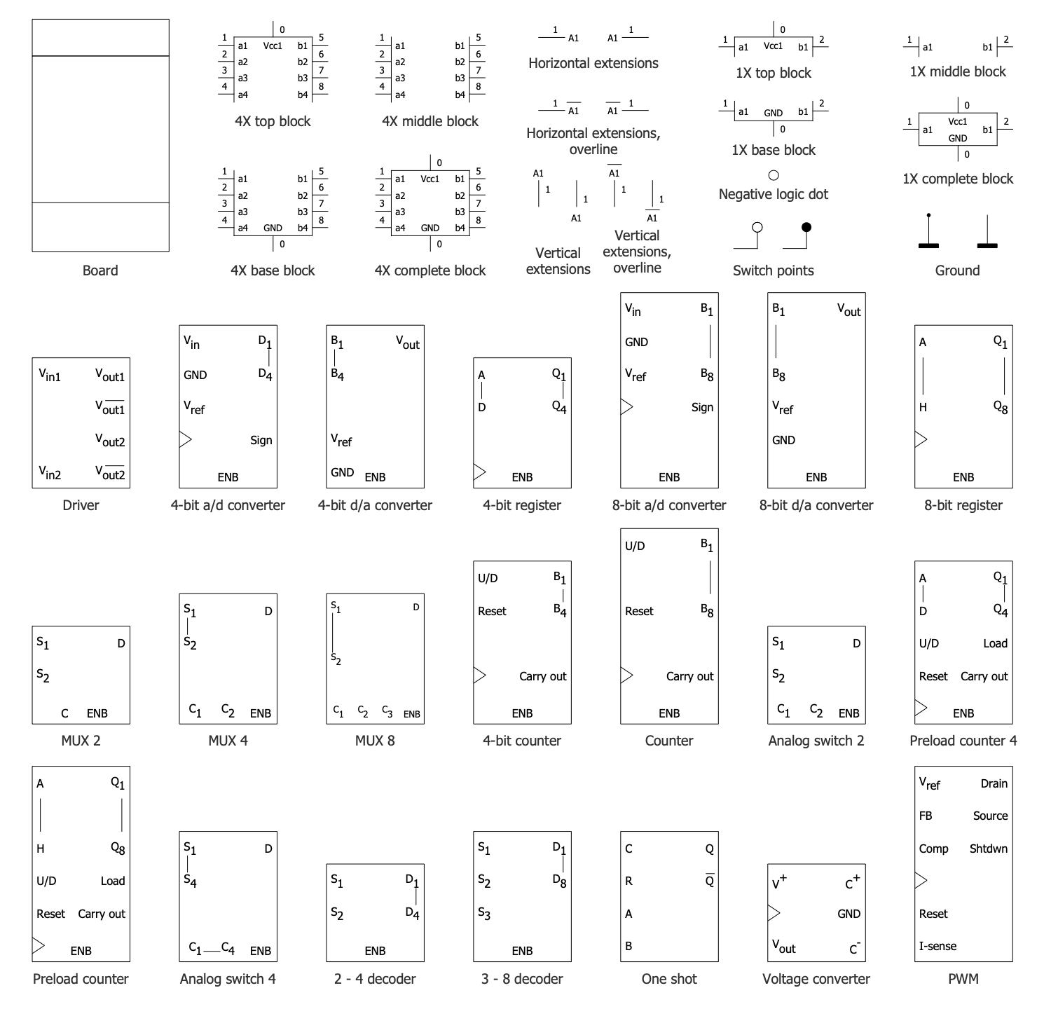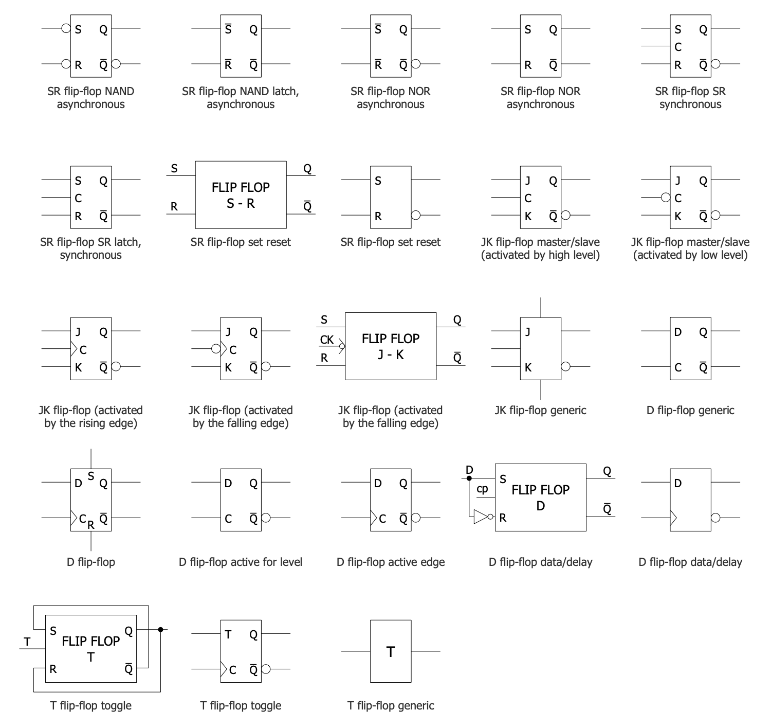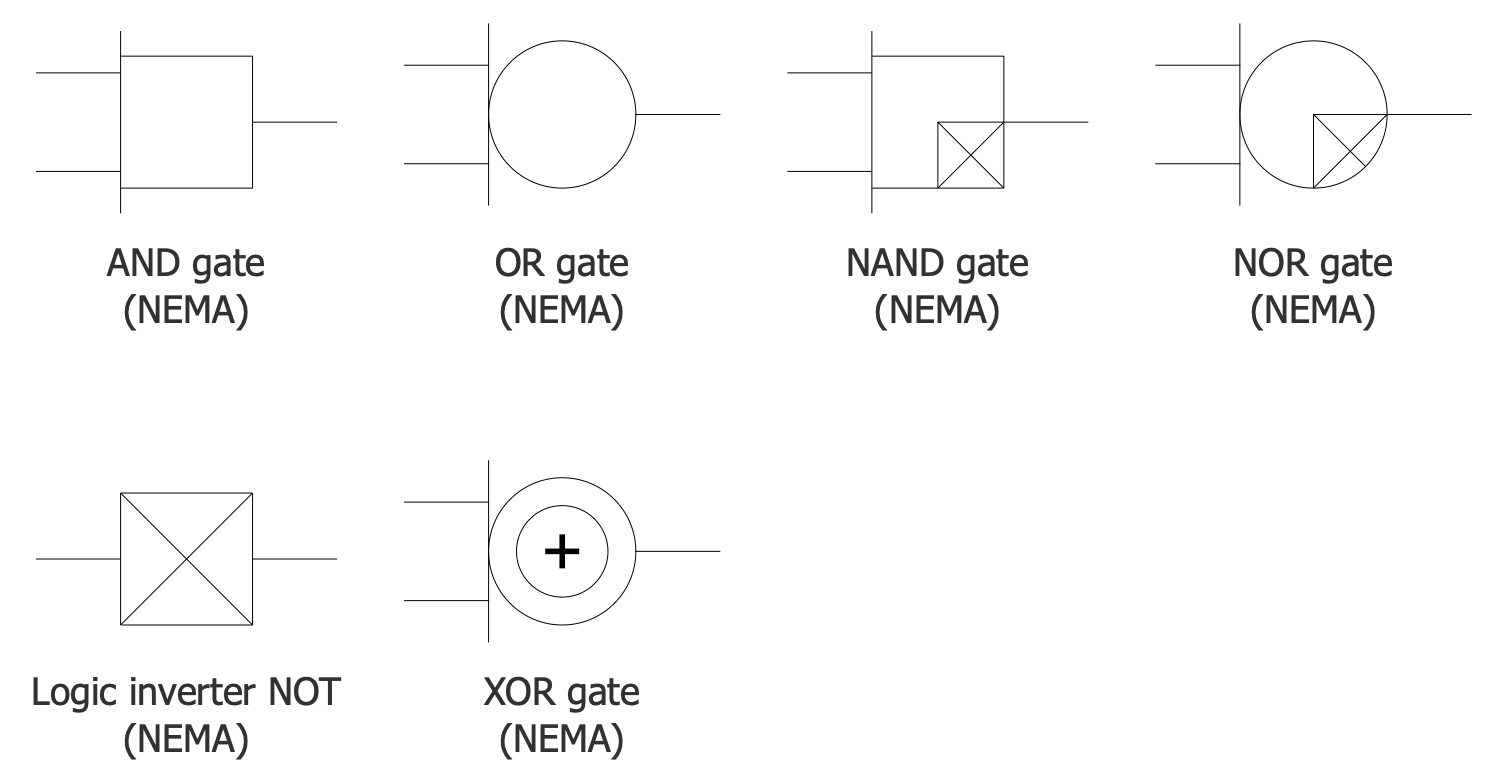 The Digital Electronics solution for ConceptDraw DIAGRAM includes a collection of multifarious diagrams samples and a large number of pre-made vector objects and digital electrical symbols of integrated circuit and connections, logic gate symbols of different kinds (ANSI, BS, DIN, IEC, NEMA), electronic logic and flip flop symbols, etc. These symbols are perfect for logic diagram design, constructing schematics for digital electronics circuits and equipment, decoder, analog to digital converter, and more schematics. Use the solution tools at all stages of electrical engineering and digital electronics design.