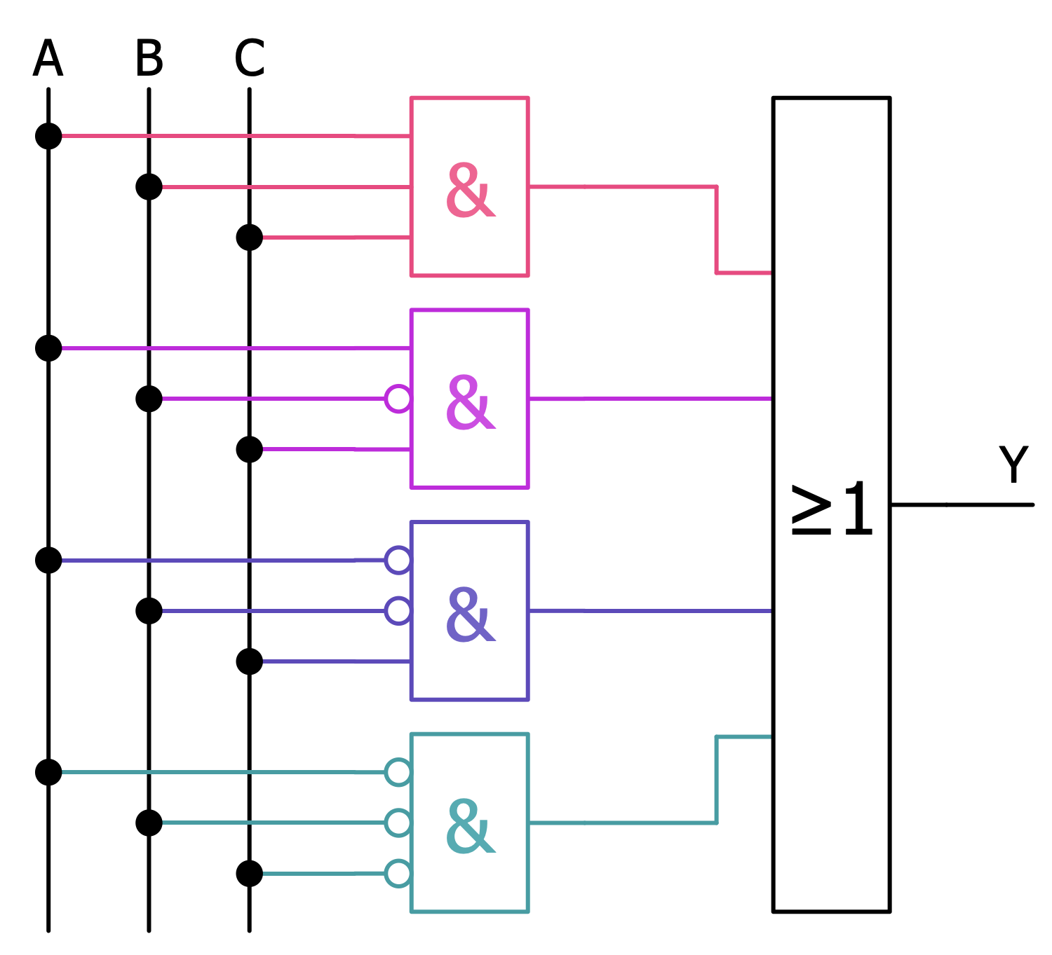 As a rule, first, a logic diagram is constructed and then it is transformed into a working electrical circuit. Each electrical component of the circuit is shown by a special symbol in the diagram. The direction of connection lines may go everywhere regardless of the flow of the signal. Moreover, the lines may intersect. In an effort to reduce cost, reduce potential errors, and avoid logical redundancy, engineers seek to reduce circuit complexity. Representing a digital circuit as a set of logic elements is a classic way in electronics. Another way is to build a system of electronic switches or transistors and represent it as a truth table.