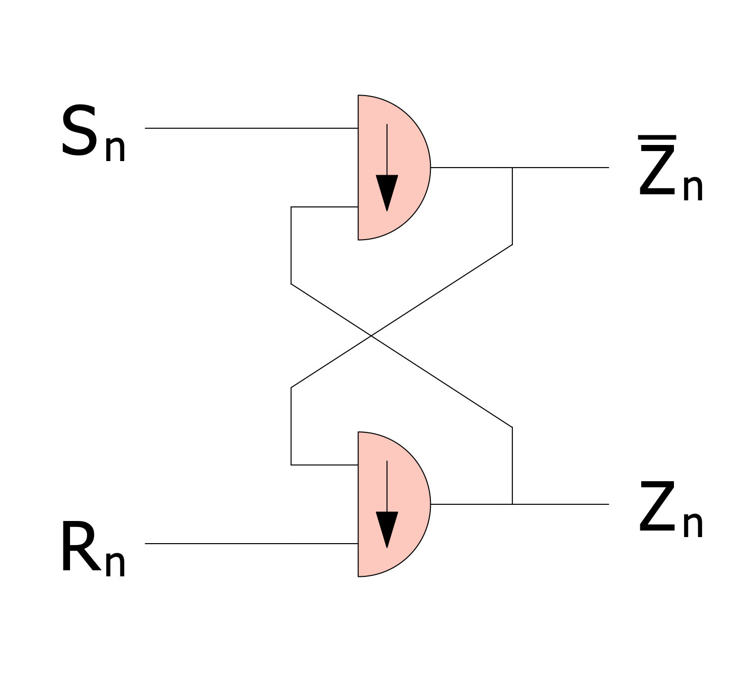 This digital electronic diagram example shows a flip-flop logic circuit. Flip-flops are ones of the basic building blocks of digital electronics systems including computers, communications, and much more. A flip-flop is a circuit that stores state information as a single bit. Flip-flops are the elements of sequential logic in electronics and have two stable states (0 or 1). Special settings allow you to configure the system to change its state depending on the signal applied to one of the control inputs. As for the outputs, the circuit has one or two. There are used both level-triggered and edge-triggered flip-flops. They are asynchronous and synchronous, respectively. The former are also transparent — any changes in the input signal cause immediate changes in the output signal. The represented trigger has the SR ("set-reset") type that influences its behavior. It consists of a pair of cross-coupled logic gates. The outputs marked Zn are in a constant state.