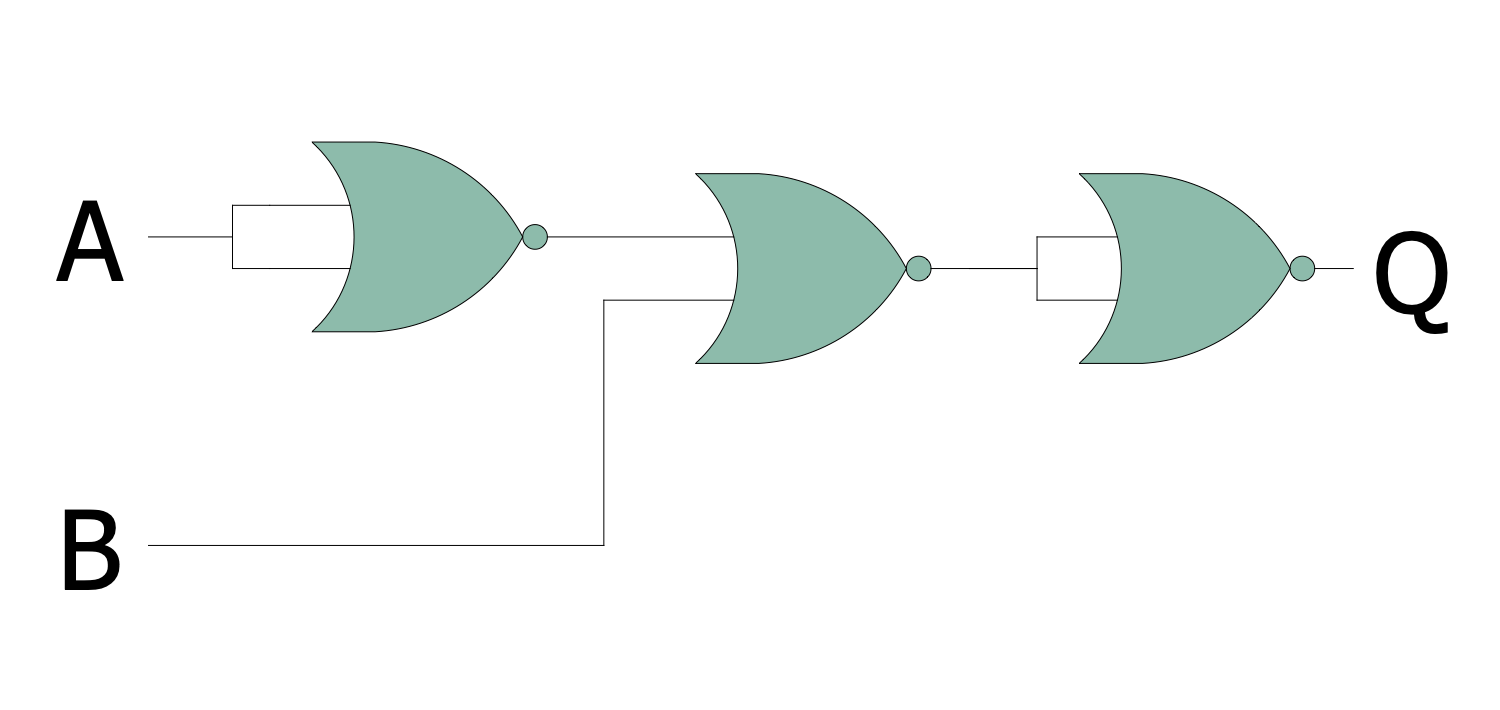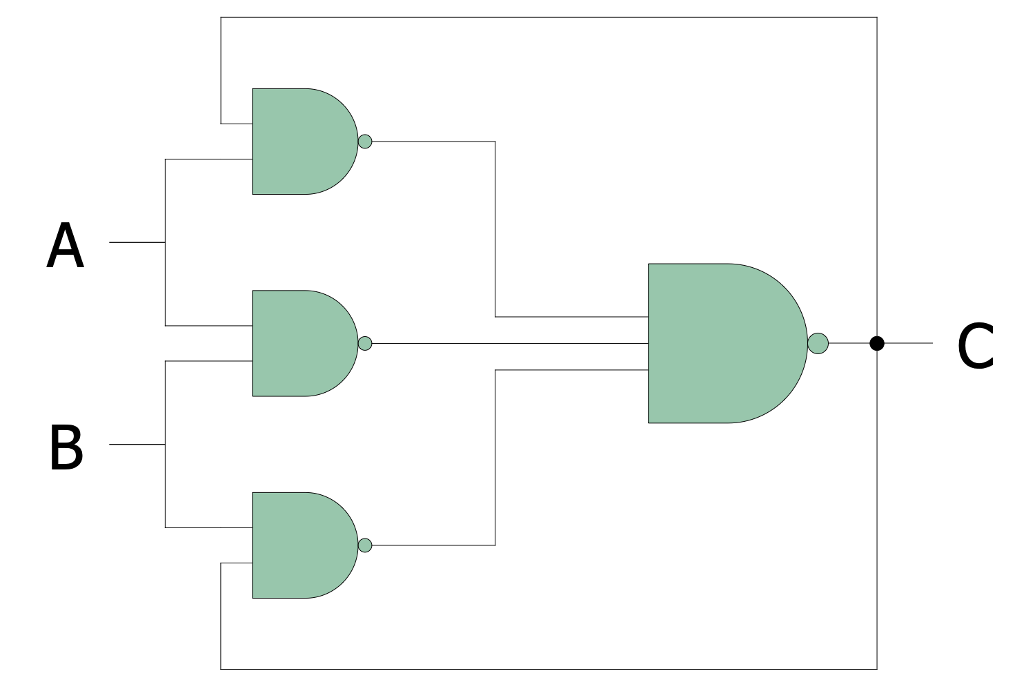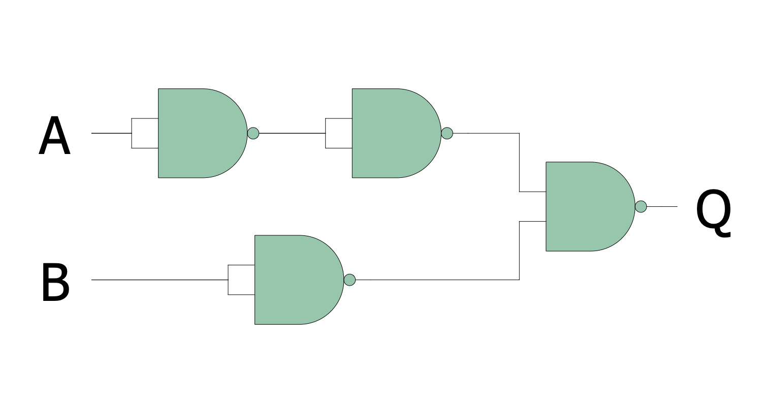 This digital electronic circuit diagram example shows an IMPLY gate made of NAND gates. IMPLY gate is a digital logic gate, that implements a logical conditional between inputs. It produces a result equal to the value of the second input when the first input is true and true otherwise. In turn, NOT-AND (NAND) gate is also a logic gate, it produces a false output only if all its inputs are true and vice versa. If any input is false or true, the output takes the true or false value respectively. As a result, its output supplements the output of the AND gate. Typically, NAND gates include two or more inputs and are available as integrated circuits. NAND gates are constructed using transistors and junction diodes. In addition, they provide functional completeness because any boolean function can be implemented using a combination of NAND gates. This is an important advantage used by most digital electronic systems with NAND gates.