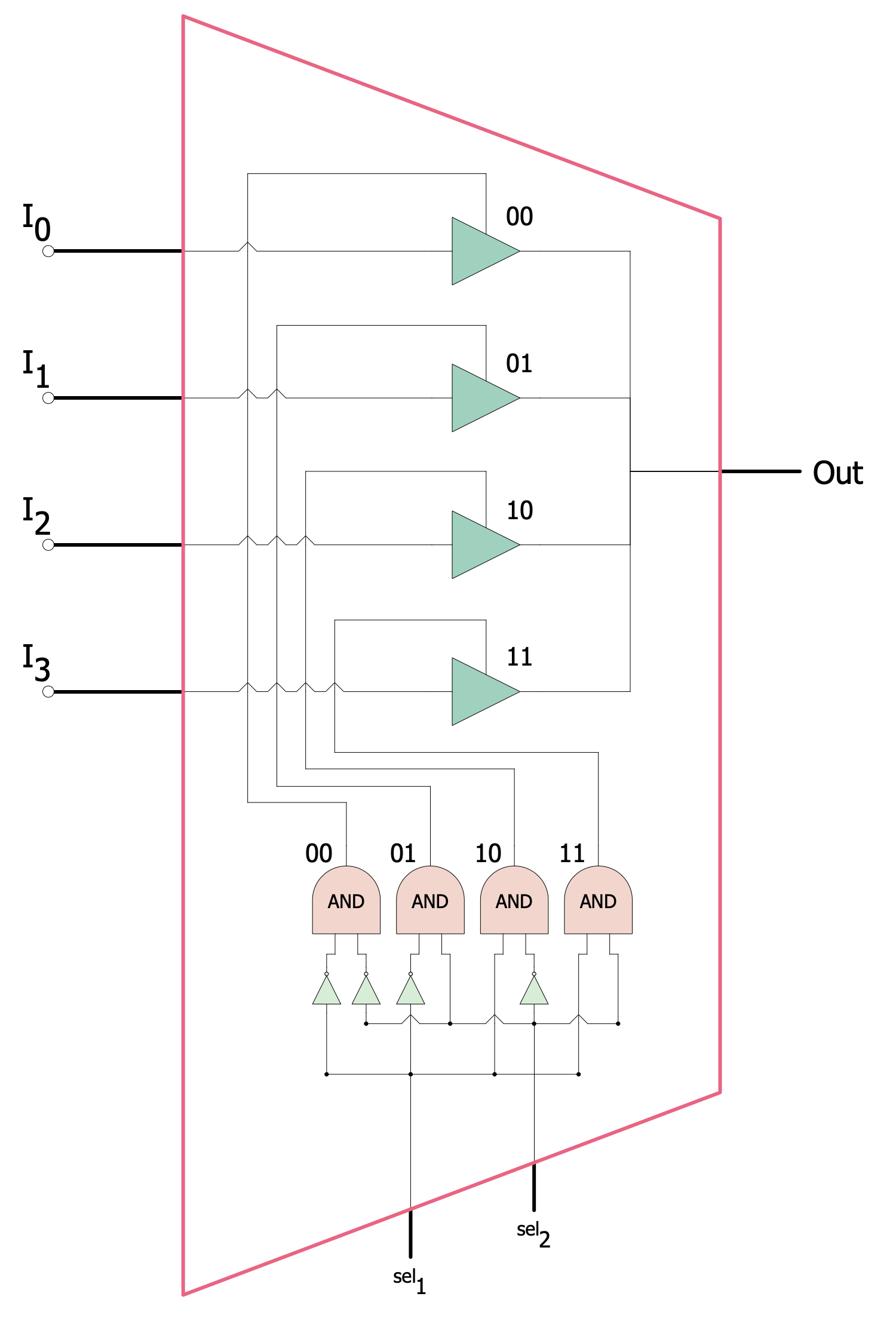 This diagram example shows a multiplexer (MUX) or a data selector realized from 3-state buffers and AND gates. It is an electronic device, which runs selection from analog or digital input signals. MUX includes several signal inputs, one or more control inputs, and one output. The signal transmission from one of several inputs to one output is the major function of a multiplexer. The selected input is forwarded to a single output line as a set of digital inputs (select lines). The 2n inputs multiplexer has n select lines. In this diagram, Sel1 and Sel2 are the control inputs. At this, Sel1 is more significant and Sel2 is less significant. The inputs are indicated by the decimal values at which the input is let through. The labels 00, 01, 10, and 11 indicate the turn-on code. A multiplexer makes possible the use of one device or resource for several input signals. Also, the multiplexers are used to implement Boolean functions of multiple variables.