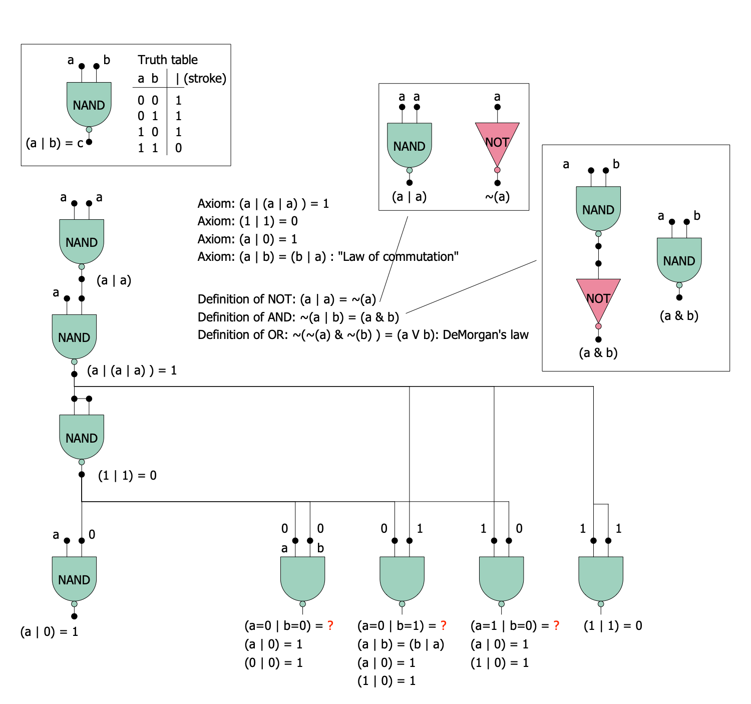 NAND gate is constructed using transistors and junction diodes and is an integrated circuit in transistor-transistor logic. NAND gate has two or more inputs and produces the output complementing to the AND gate. The output is false only when all inputs are true. If any input is false, an output is true. NOR gate is a digital logic gate, it implements logical NOR and is the negation of the OR operator. The output result of the NAND gate is true if both the inputs to the gate are false. If one or both inputs are true, the output is false. In general, NAND and NOR gates are functionally completed. That's why any Boolean function can be implemented by using a combination of NAND gates. ConceptDraw's Digital Electronics solution is perfect for easy designing any kind of digital electronic circuit diagrams, analog to digital converter schematics, and more charts.