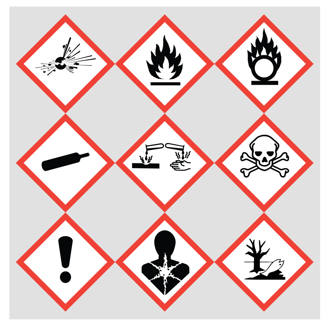 There are two types of GHS pictograms or Hazardous symbols: standard pictograms are used to mark the containers, vessels and working places, and transport pictograms are used for transporting of dangerous goods.Standard pictogram hazard is a diamond with a black symbol placed on a white background with a red border.
