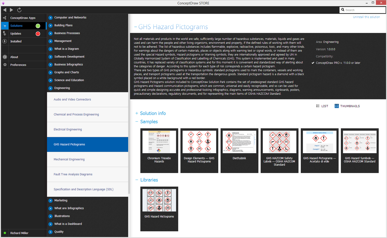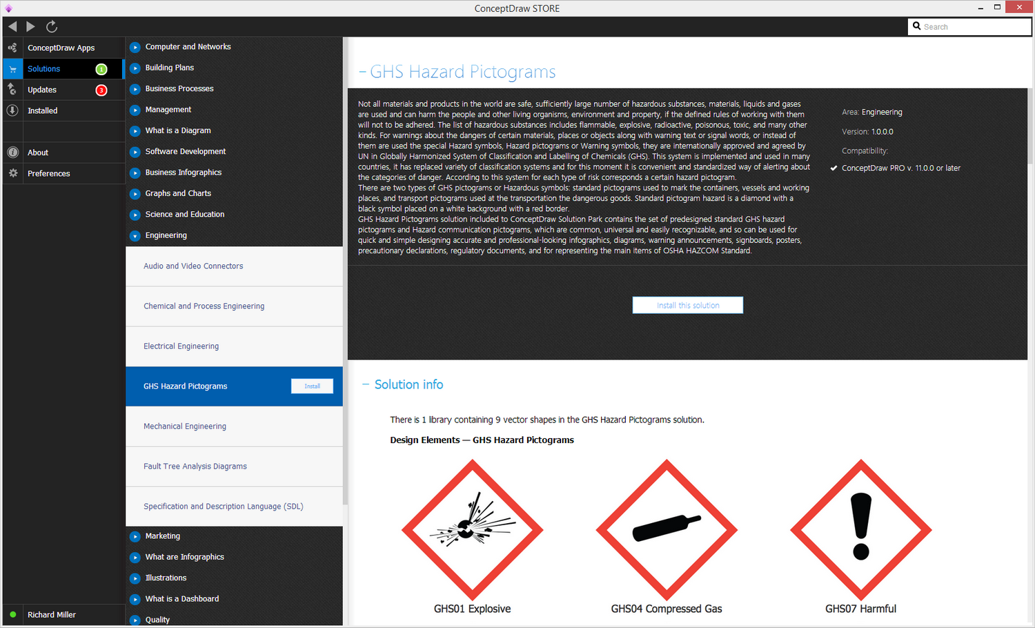 After ConceptDraw STORE and ConceptDraw DIAGRAM are downloaded and installed, you can install the GHS Hazard Pictograms solution from the ConceptDraw STORE.