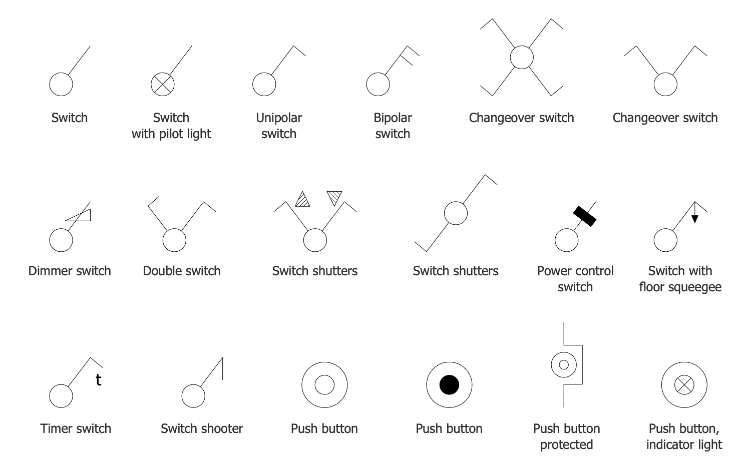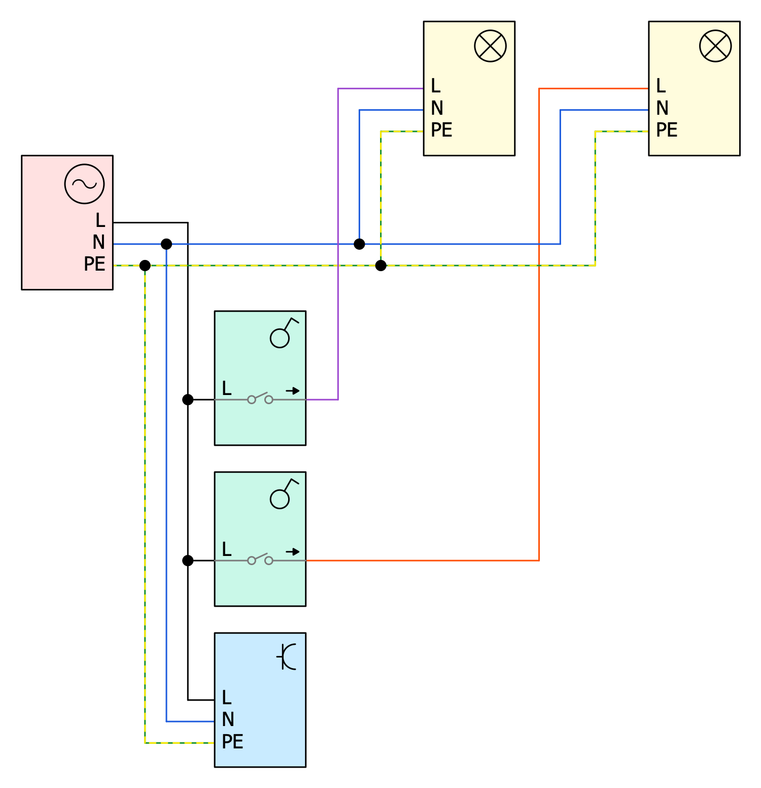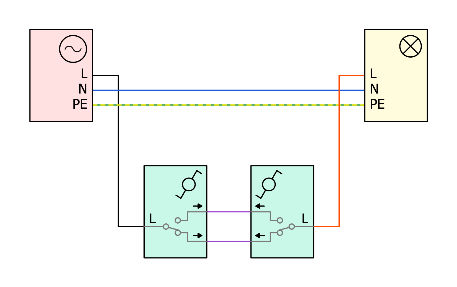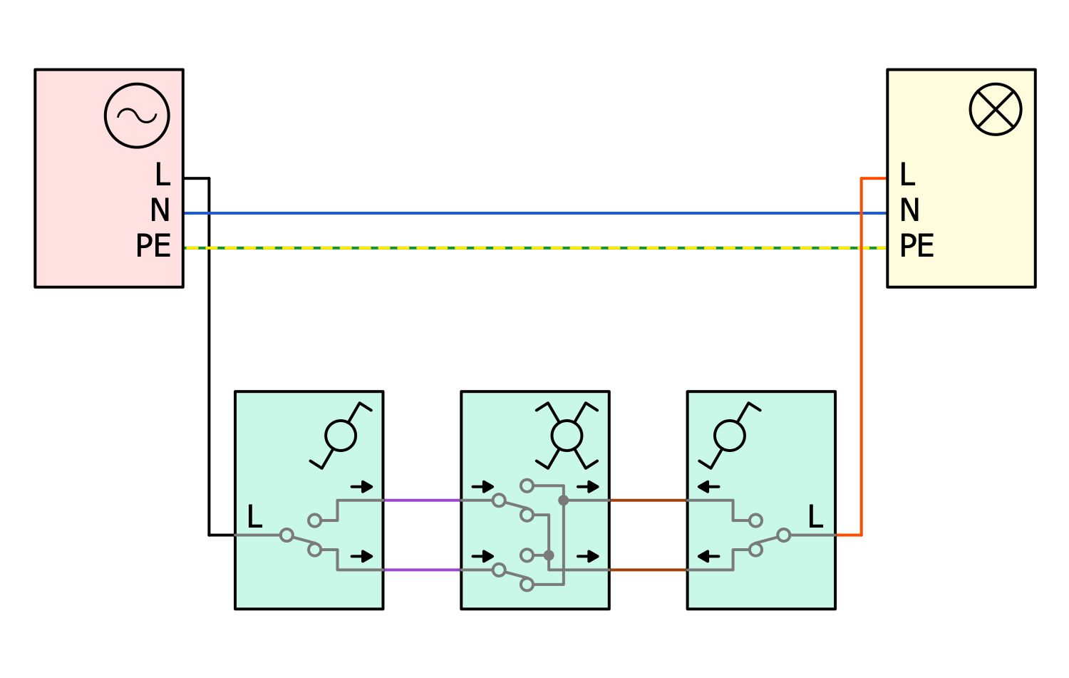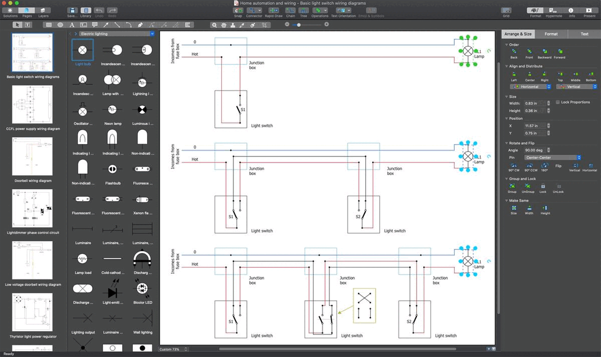 This diagram shows a circuit that includes a lamp and three switches. The switches are cross-linked. The circuit includes two single switches and one double. Two switches are reconnected to two corresponding switches. A two-position switch connects two other switches in parallel. Two switches conduct phase current. The lamp lights up when the first switch is connected to the second in phase, and the third switch to the fourth in antiphase. The switches are toggled from bottom to top and up to down. This is why they overlap. ConceptDraw DIAGRAM software and home automation and wiring solution enable you to create a wide variety of wiring diagrams, electrical wiring diagrams, home appliance wiring plans and more. Use it to create circuits with one, two or more switches, one or more lamps, and a fuse box, sockets or without them and more diagrams.