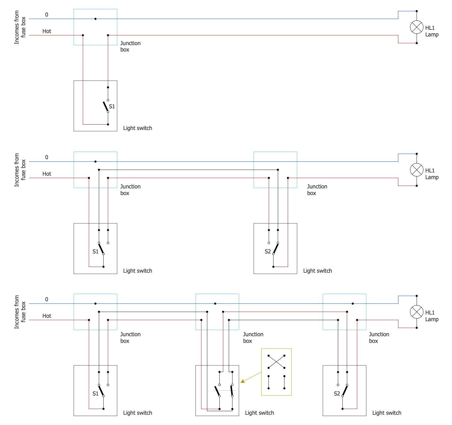 This sample shows a set of basic wiring diagrams of the light switches. You can see the schematics of the correct use of junction boxes and switches. The junction boxes help to avoid problems with many wires. Because sometimes the superfluous wires are connected in a small outlet box that makes a mess and inconvenience. As for the switches, the use of two or more electrical switches is widespread. Numerous switches allow controlling an electrical load and lighting from more than one location. The installation of the two-way, three-way or four-way switches allows you to control a light from the corresponding number of locations. These can be opposite sides of a large room, a long hallway, the top and bottom of a stairway, etc. These schematics are basic and you can easily modify them according to your needs and requirements. At the use of parts with metal cover, add a ground wire or use the knots with dielectric cover.