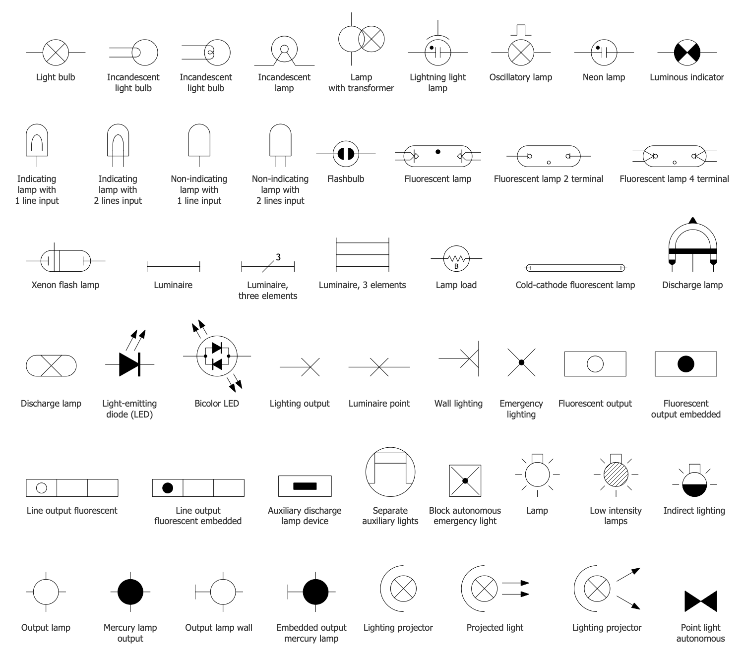 This sample shows a simplified schematic of a phase control circuit used for dimming a light. The dimming process is generally directed at the control of the amount of electrical power supplied to a light source and changing brightness. The different types of dimming are applied. The universal dimmers are most widespread, they recognize the load characteristics and adjust the control method accordingly. More complex circuits are controlled by the phase control dimmers. At the same time, because the discharge is destroyed at low voltage, fluorescent lamps and gas-discharge lamps cannot be darkened. The use of potentiometer P in this diagram allows changing the brightness of the incandescent lamp La. The lamp is controlled by a triac Tr and is lit via diac Di. R1 and C1 reduce the hysteresis, and R2 and C2 form two phase shifts. AC voltage has a delay. The lower the resistance of the potentiometer P is, the earlier Di and Tr will light up and the lamp will light brighter. A collection of electrical symbols included to the libraries of Home Automation and Wiring solution is a perfect assistant in designing home automation diagrams and plans.