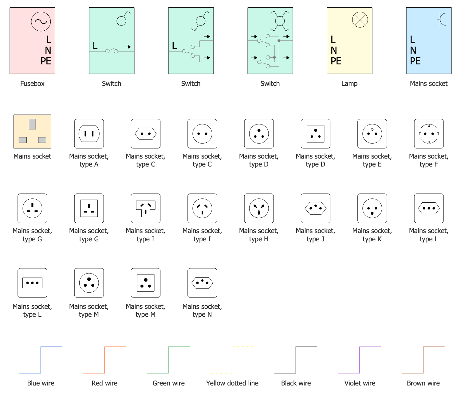 This electric diagram includes a fusebox, two switches, two lamps, and a socket. The lamps in this schematic are switched on independently of each other. The lights located in different rooms have their own different connection schemes and differ in the number of switches. Switches and sockets are used to control the lights. Typically, the lighting fixtures on walls and ceiling do not have plugs and are switched using switches mounted on the wall. In addition, the lights of different and the same types of connection are also often combined in one room. In any case, they are connected as parallel consumers. The switch is connected to the lamp by a special conductor called a switched conductor. Some devices include an internal circuit allowing them to work for a certain time even after switching off. The bright colors are applied in Wiring diagrams for a visual effect and to highlight important points. Use the pre-made wiring diagram symbols from the libraries of Home Automation and Wiring solution to construct efficiently your own Wiring diagrams.