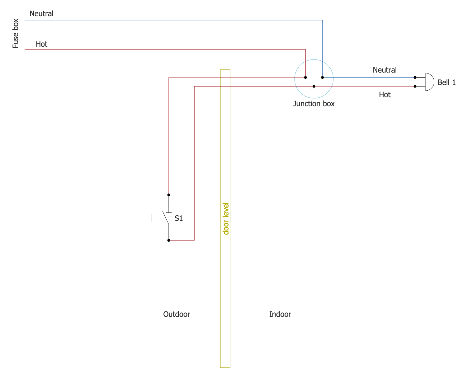 This Wiring diagram shows a typical doorbell circuit. Being a type of signaling device, a doorbell is installed outside the apartment, house, or another premise. Typically, it is placed next to the entrance door. Being activated, in common by a simple press, it provides the bell ring inside the corresponding premise. A doorbell includes three main parts: the push button, the chime, and the transformer. These parts are connected with wires in a doorbell of a wired-type system. This diagram is a simple guide on how to wire a doorbell. Hot and neutral wires are differentiated by colors: red and blue. The mechanism of work is quite simple. When the doorbell button is pressed, the doorbell circuit is closed and the doorbell rings. But the doorbell cannot be connected directly to the electrical system and requires a lower voltage. The transformer is used to reduce the voltage from 120 or 240 volts to the value at which the doorbell operates (10-24 volts). Usually the doorbell transformer is connected to an electrical junction box.