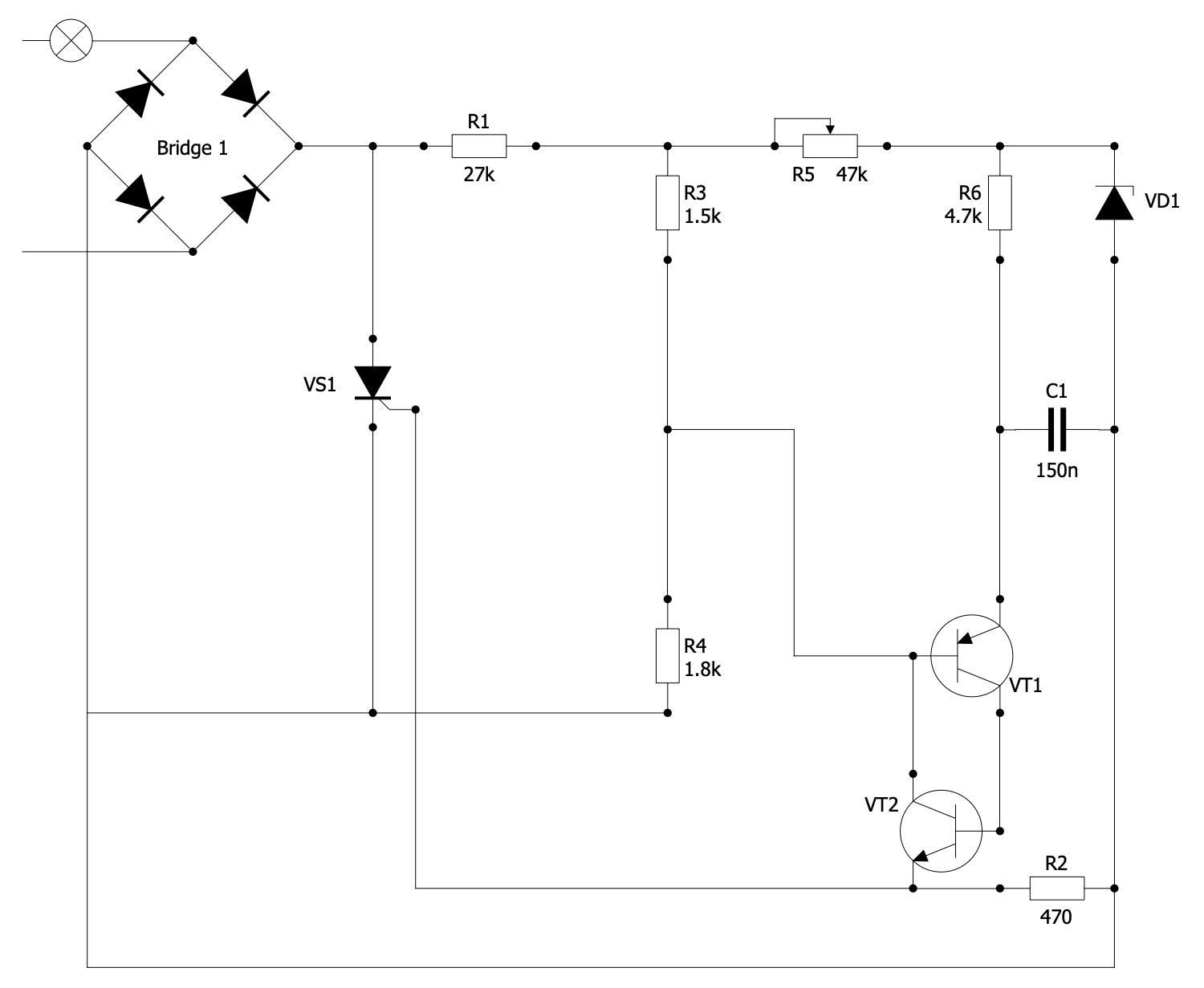 This diagram sample shows the electrical schematic of a light power regulator using a thyristor. The thyristor light power regulator allows you to change the power supplied to the load due to the delay in turning on the thyristor in the half-cycle of the alternating current. The thyristor is a key component of this circuit. When a signal appears on the control electrode, the thyristor opens. The longer the switch-on delay is, the less power is supplied to the load. Transistors VT1 and VT2 operate in the key mode. When the voltage on the capacitor C1 is equal to the voltage at the point between the resistors R3 and R4, the transistors open. They send a signal to the control electrode of the thyristor VS1. The capacitor is discharged and the thyristor opens until the next half cycle. This circuit is quite simple and starts working immediately after switching on. It is mainly applied to power control of AC loads, universal collector motors, incandescent lamps. However, the use of 5 power elements that heat up during operation is its key disadvantage compared to triac regulators using one power element.