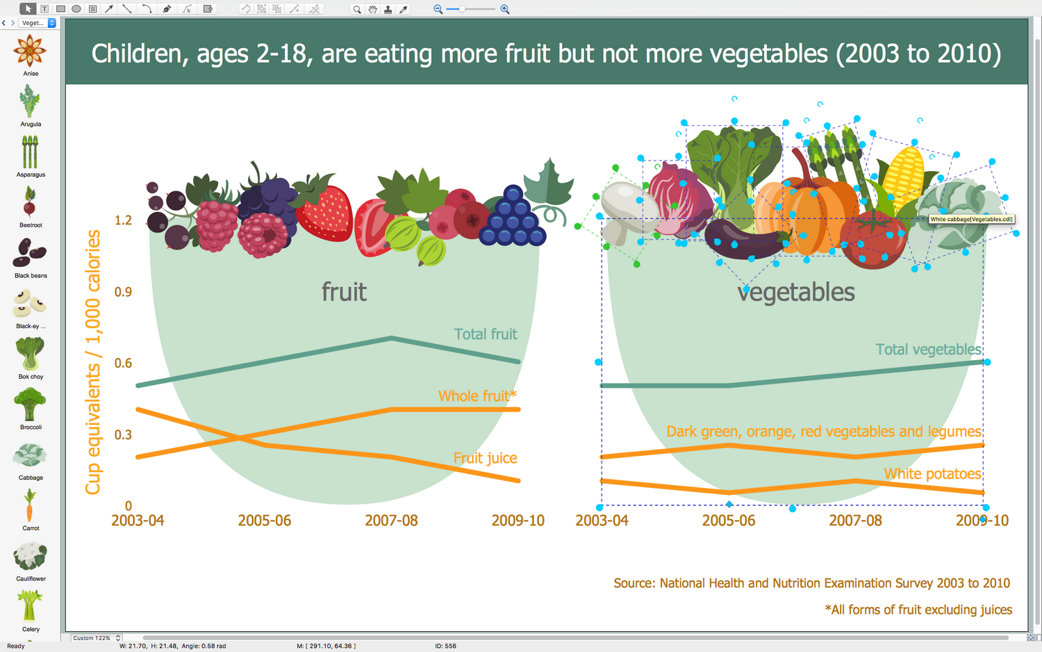 Much is said about the importance of eating properly — this graphic shows that bad habits starts at an early age. Use the pictures of food from the solution libraries to illustrate charts and graphs.
