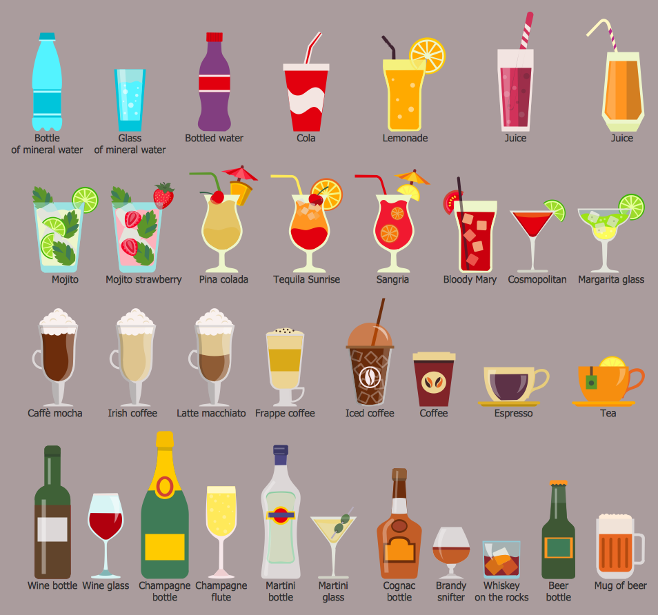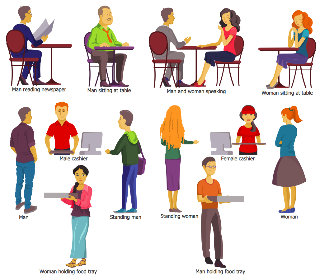 The Food Court solution can be used for increasing the illustrative opportunities of the ConceptDraw DIAGRAM diagramming and drawing software by adding the vector stencil clipart, depicting food and beverages, as well as the figures from a cafe scene.