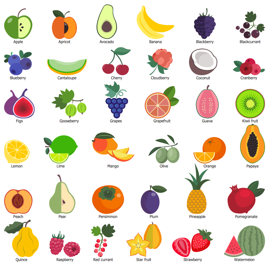 This diagram was created in ConceptDraw DIAGRAM using the Fruits library from the Food Court solution. An experienced user spent 15 minutes creating this sample.