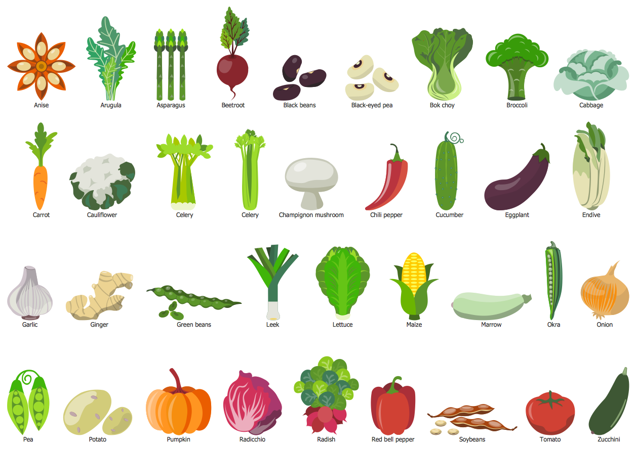This diagram was created in ConceptDraw DIAGRAM using the Fruits and Vegetables libraries from the Food Court solution. An experienced user spent 20 minutes creating this sample.