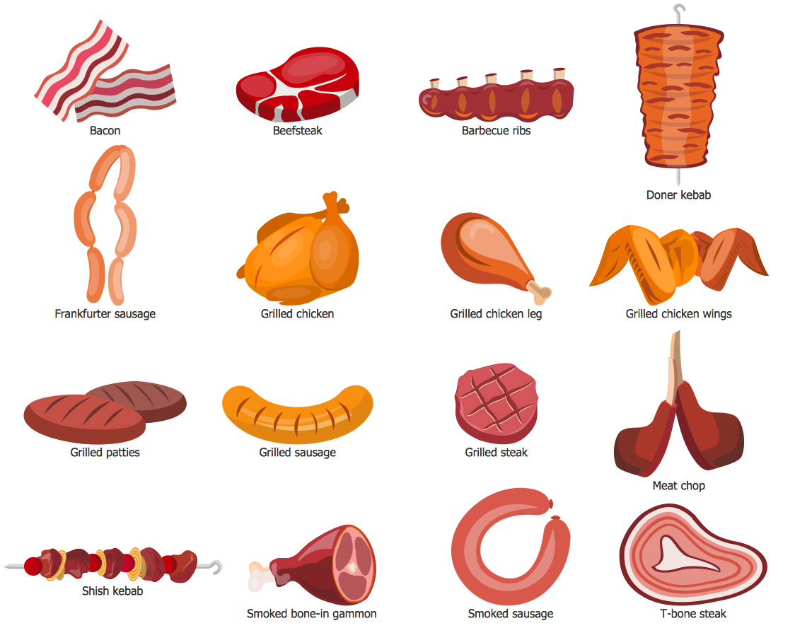 This diagram was created in ConceptDraw DIAGRAM using the Fast Food, Fruit and Meat libraries from the Food Court solution. An experienced user spent 10 minutes creating this sample.
