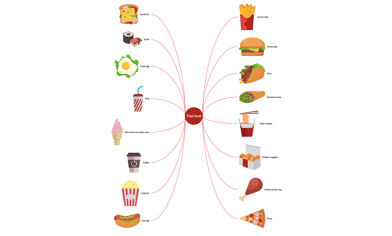 This Mind Map represents the variety of fast food that is mass-produced food, which time of cooking and serving is significantly reduced compared to traditional cooking. The sandwich, sushi, fried egg, cola, soft-serve ice-cream cone, coffee, popcorn, hot dog, French fries, hamburger, taco, sandwich wrap, rice noodles, chicken nuggets, grilled chicken leg, and pizza depicted on this sample refer to the fast food. Typically, fast food isn't a healthy meal, but it is very popular due to the fact that it is quick in preparation, so you do not need to wait long when you haven't got a lot of time, it is also can be eaten literally on the move, and ones of the most important reasons for great popularity — it is inexpensive and tasty for many people. Besides, the fast food is always nearby you, there are a huge variety of points of its sale in places of a mass congestion of people in big cities, in places popular among the tourists, in entertainment parks, and food court areas.