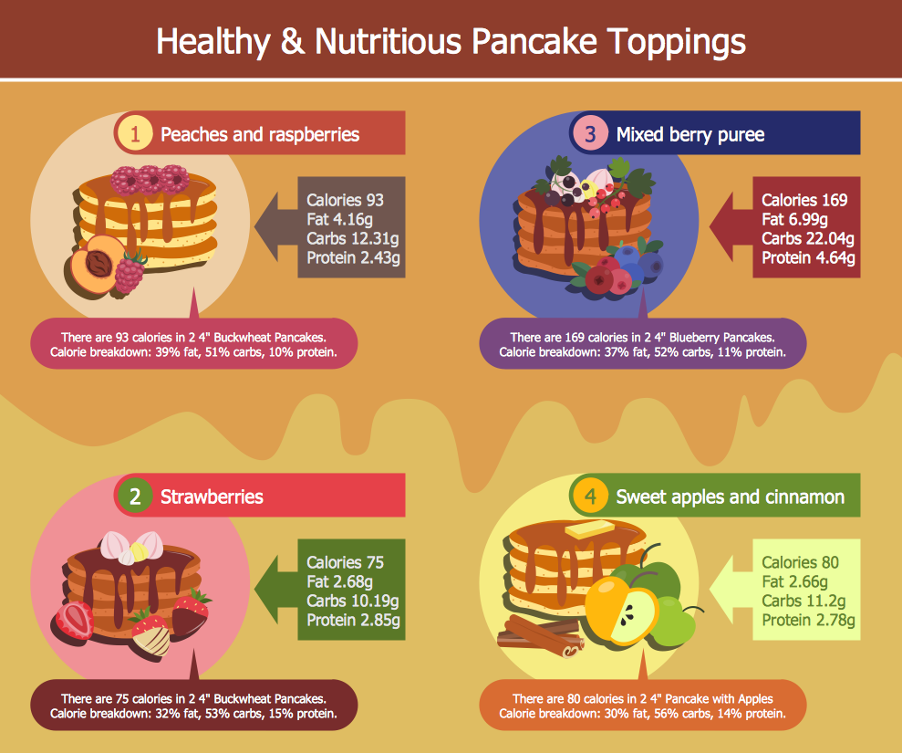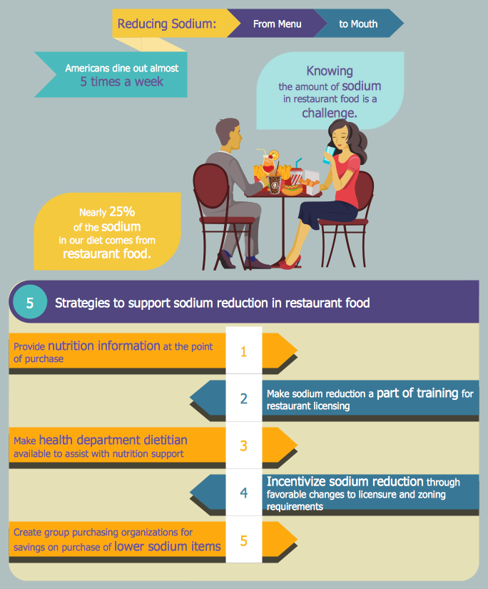 Any of the mentioned samples can be always edited by any ConceptDraw DIAGRAM user once taken from the Food Court solution. In order to make an effective infographic that combines concepts, facts and other food-related illustrations in order to use it for any needed purpose such as an educational one, the Food Court solution can be used in combination with the basic libraries from ConceptDraw DIAGRAM.