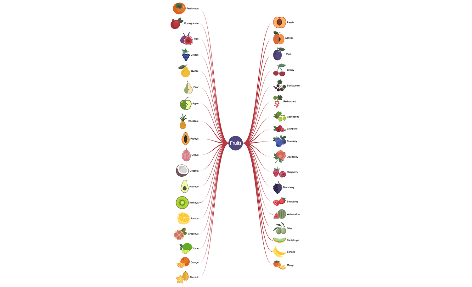This Mind Map illustrates the diversity of fruits: persimmon, pomegranate, figs, grapes, quince, pear, apple, pineapple, papaya, guava, coconut, avocado, kiwi fruit, lemon, grapefruit, lime, orange, star fruit, peach, apricot, plum, cherry, blackcurrant, red currant, gooseberry, cranberry, blueberry, cloudberry, raspberry, blackberry, strawberry, watermelon, olive, cantaloupe, banana, mango. All these fruits are edible as is in a raw form, baked, and boiled, they are used in cooking different tasty dishes. The fruits are fleshy seed-associated structures of plants. They compose a significant part of the world's agricultural production and are a really popular source of food for humans, animals, and birds. Typically, the fruits have different tastes and flavors depending on the sort, the tastes differentiate from the sweet to sour, and tart. Use the ready clipart images from the Food Court solution graphic sets to construct the illustrative Mind Maps. Brainstorm the tasty dishes with fruits and easily organize them in maps.