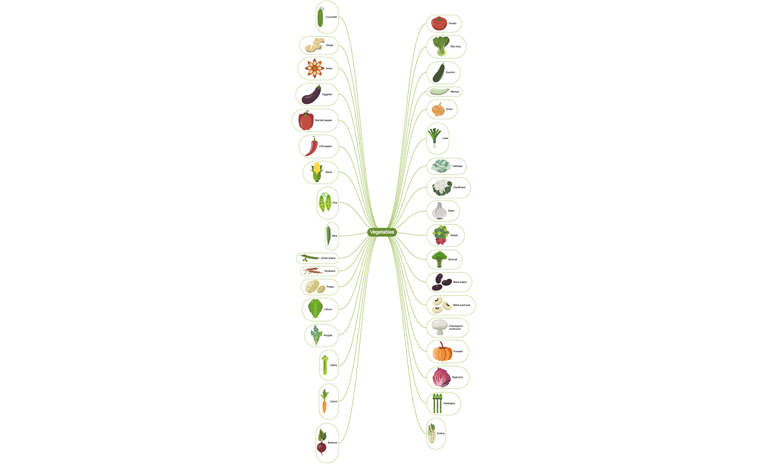 This Mind Map demonstrates the abundance of vegetables, mushrooms, legumes, and spices: cucumber, tomato, ginger, bok choy, anise, eggplant, red bell pepper, chili pepper, zucchini, marrow, onion leek, maize, cabbage, pea, cauliflower, okra, garlic, radish, broccoli, green beans, soybeans, black beans, black-eyed pea, potato, lettuce, arugula, champignon mushroom, celery, pumpkin, radicchio, carrot, asparagus, beetroot, and endive. The vegetables are one of the most important sources of food for people and many other living organisms on Earth. It is the most valuable fount of vitamins and minerals. The vegetables are used for cooking a lot of dishes. Being taken in raw, boiled or roasted form, they can be mixed in different variations, allowing creating completely vegetable dishes. They are also combined with meat and fish. The spices and greens are an important part of many dishes too, they are able to radically change the taste of any dish and to make it especial.