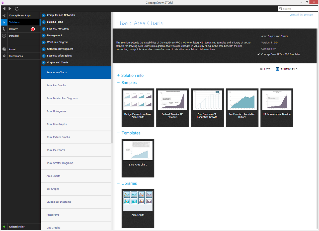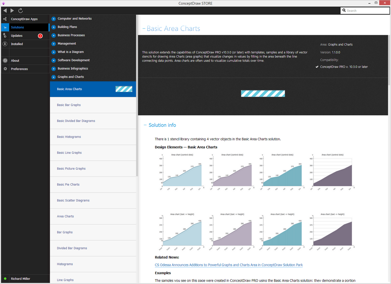 After ConceptDraw STORE and ConceptDraw DIAGRAM are downloaded and installed, you can install the Basic Area Charts solution from the ConceptDraw STORE.