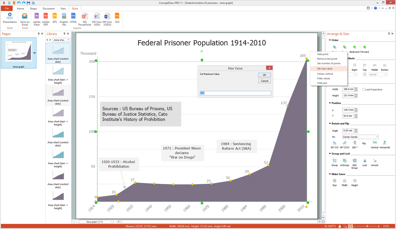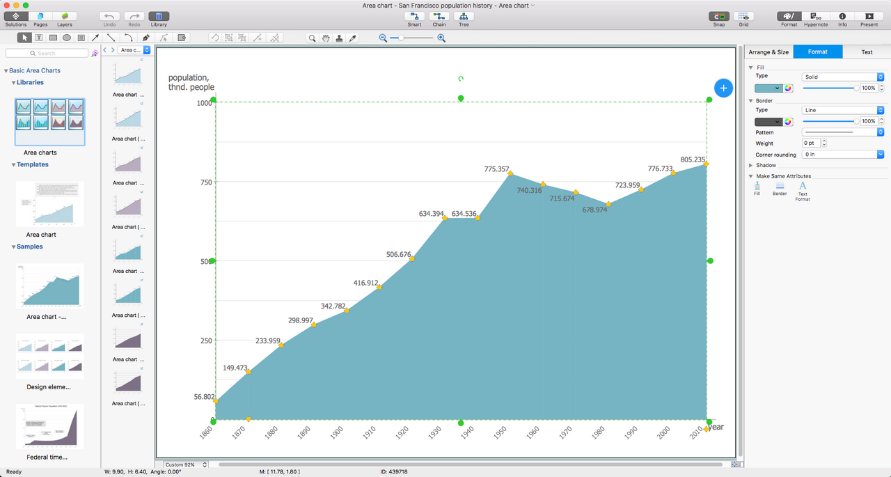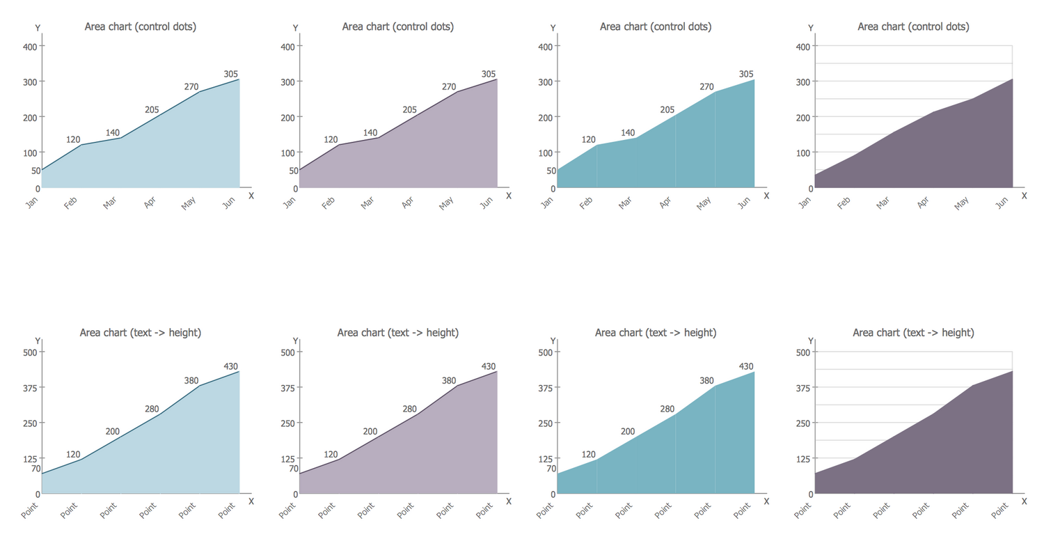 This solution extends the capabilities of ConceptDraw DIAGRAM with templates, samples and a library of vector stencils for drawing Area Charts (area graphs) that visualize changes in values by filling in the area beneath the line connecting data points. Area charts are often used to visualize cumulative totals over time.