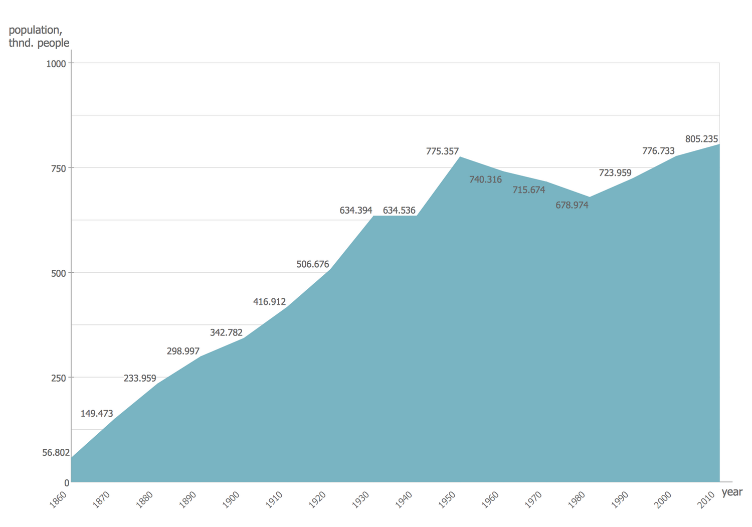 This sample shows San Francisco population history. Using an Area Chart allows you to represent how population has changed over the last 150 years.