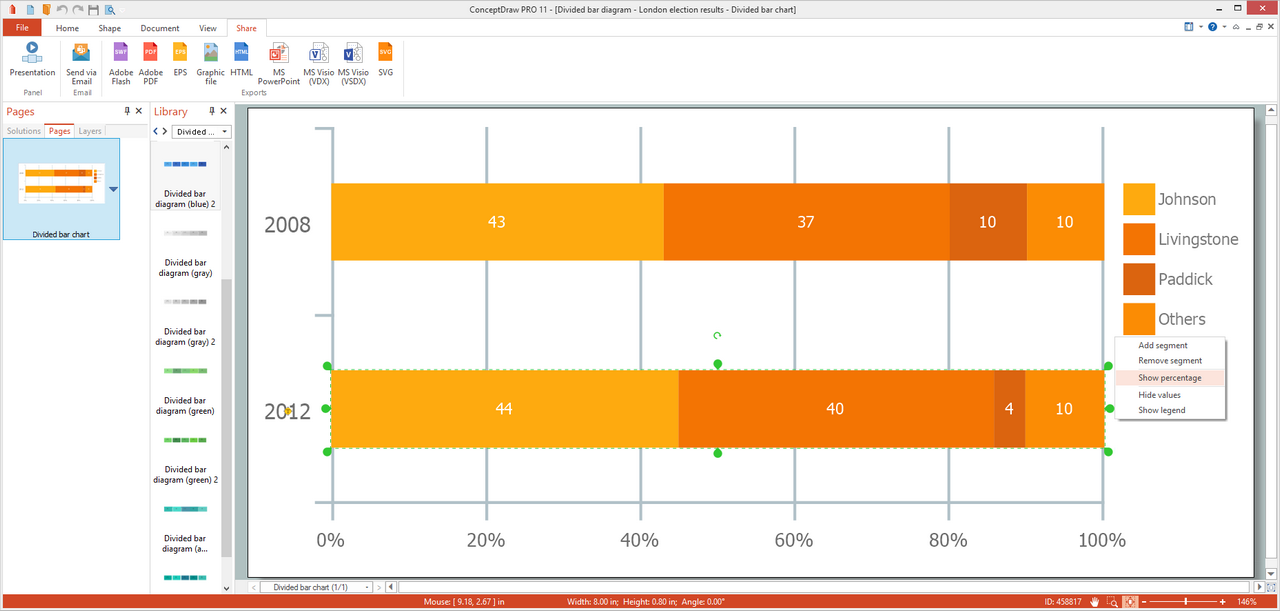 All source documents are vector graphic documents which are always available for modifying, reviewing and/or converting to many different formats, such as MS PowerPoint, PDF file, MS Visio, and many other graphic ones from the ConceptDraw Solution Park or ConceptDraw STORE. The Basic Divided Bar Diagrams solution is available to all ConceptDraw DIAGRAM users to get installed and used while working in the ConceptDraw DIAGRAM diagramming and drawing software.
