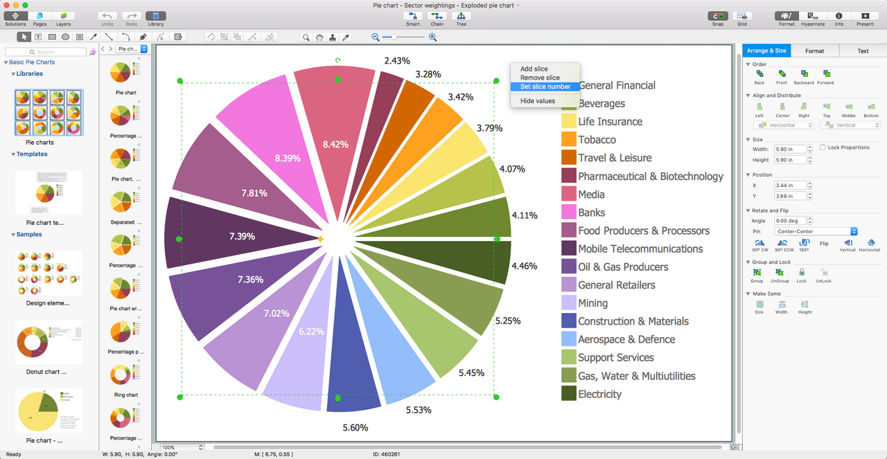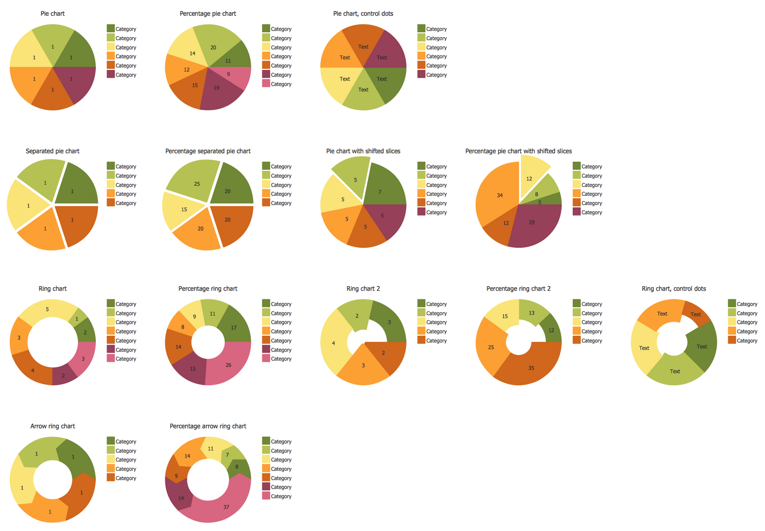The Basic Pie Charts Solution contains ready-to-use templates with pie charts. You can input your data to an existing template and then redesign it according to your taste.