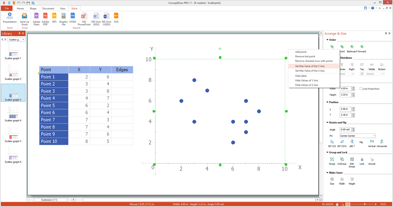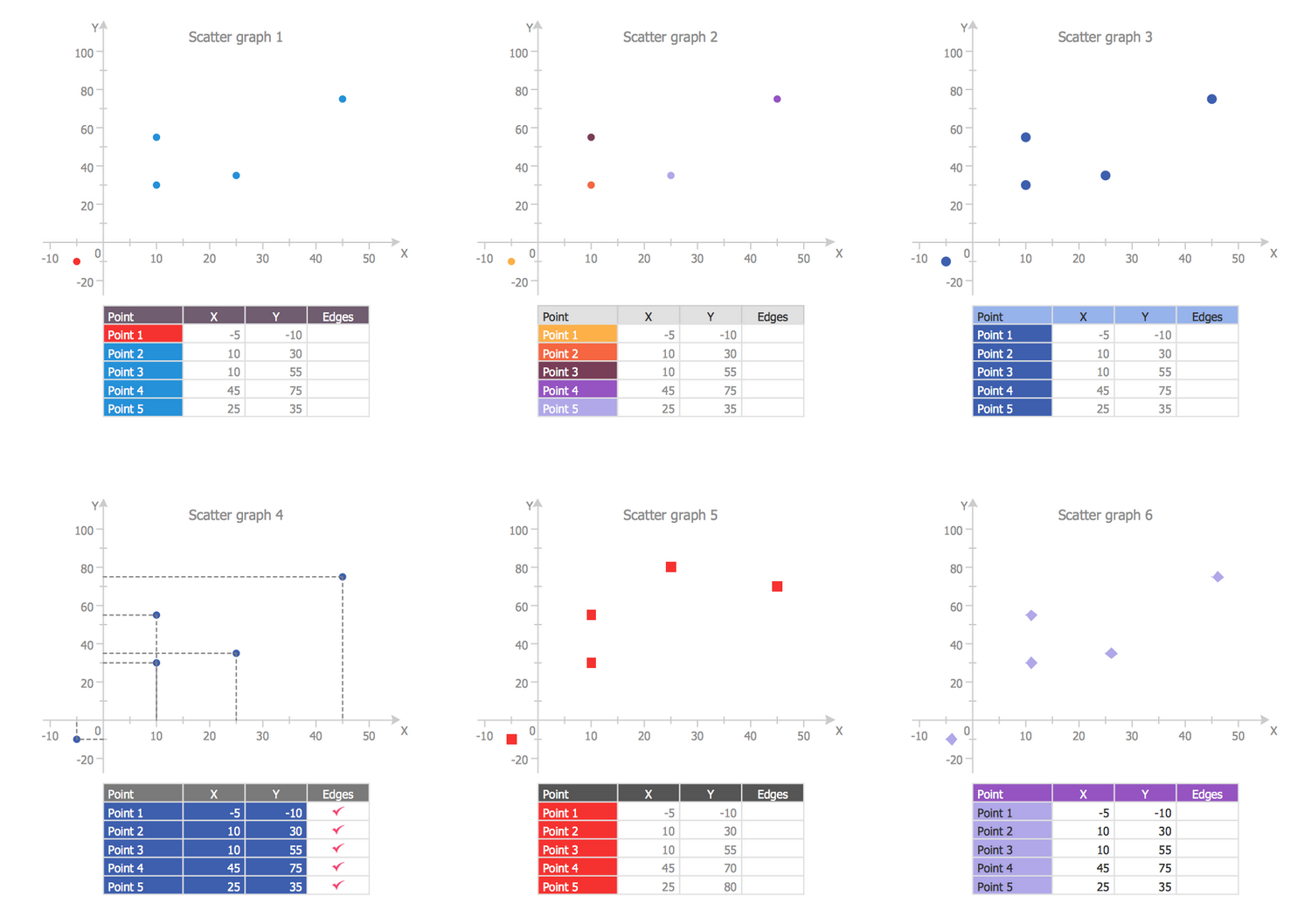There is 1 stencil library containing 6 vector objects in the Basic Scatter Diagrams solution.