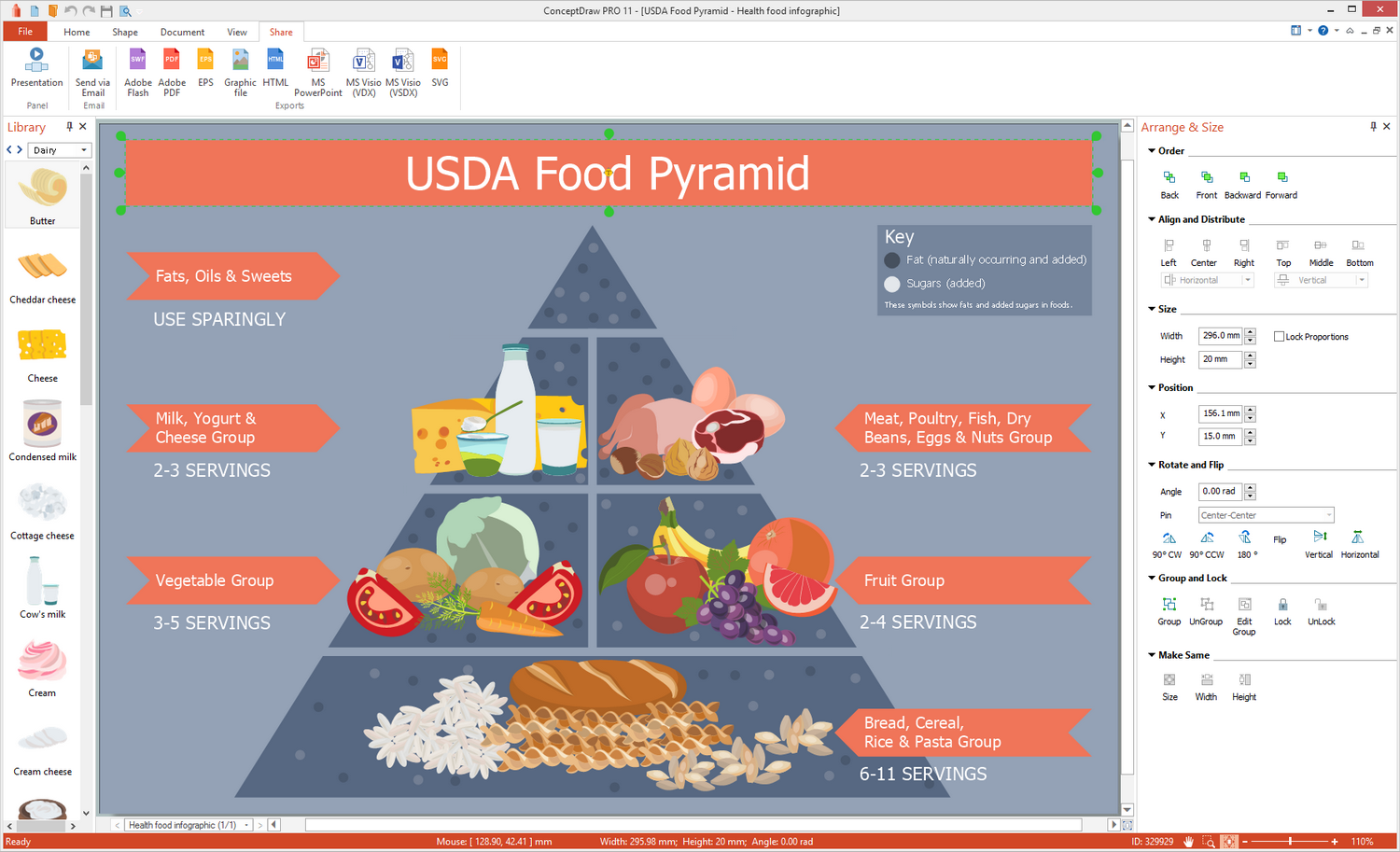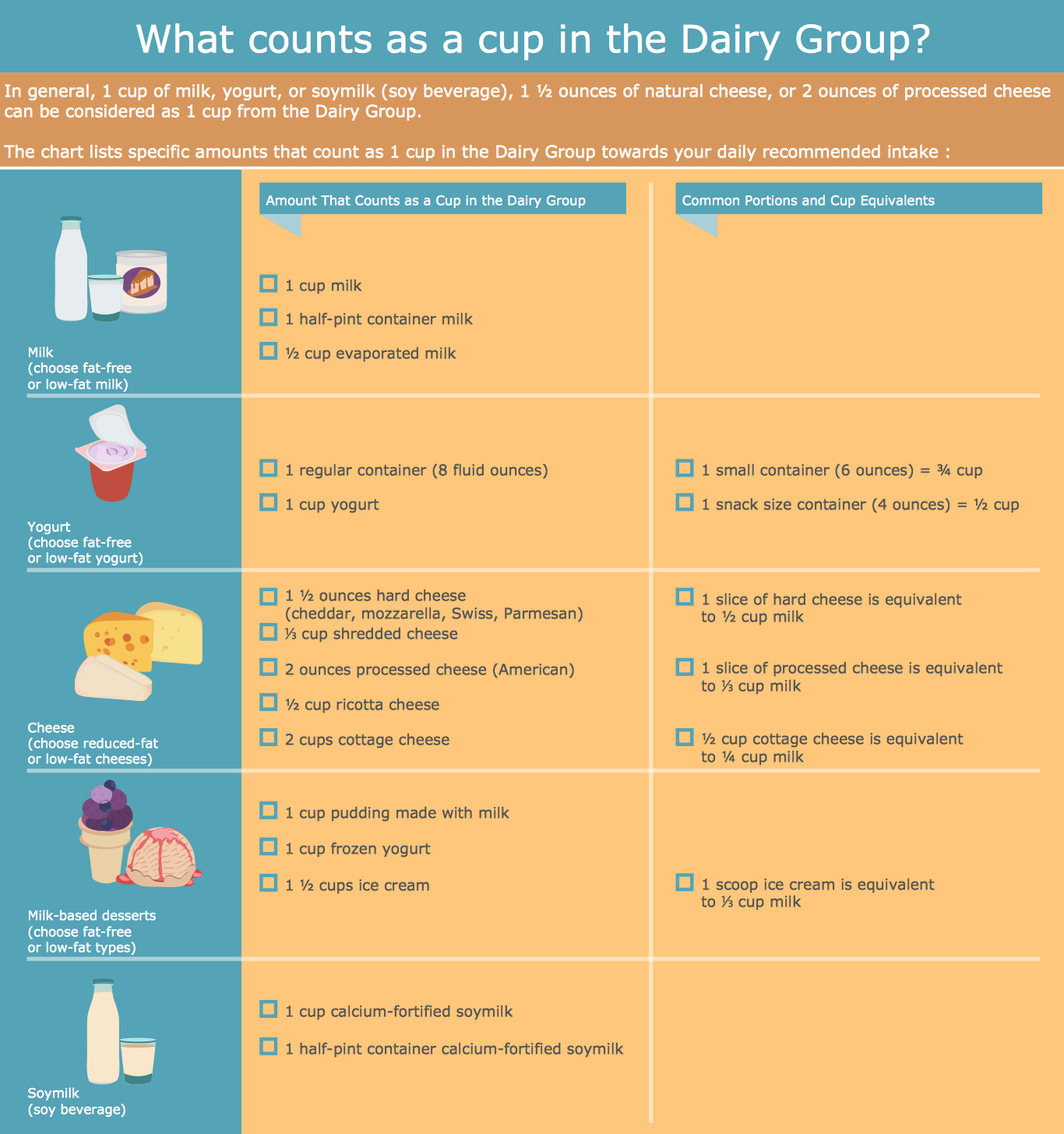 This sample visually illustrates the dairy food group and shows what represents a 'cup' measurement for each food item. ConceptDraw DIAGRAM allows you to create clear, colorful illustrations, with distinct areas for separate pieces of information.