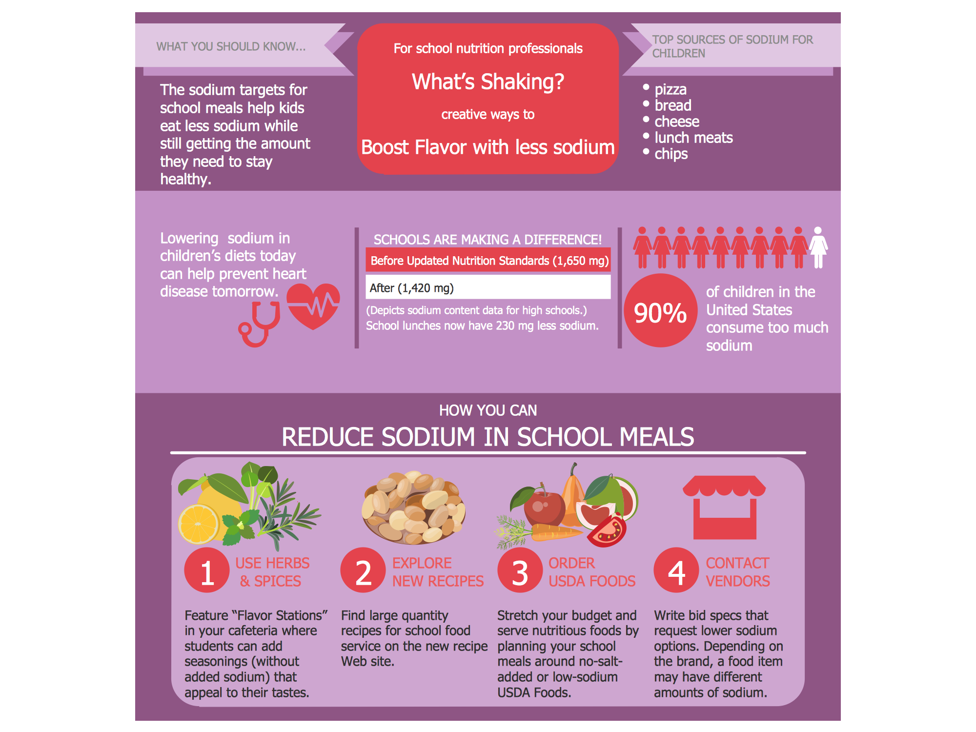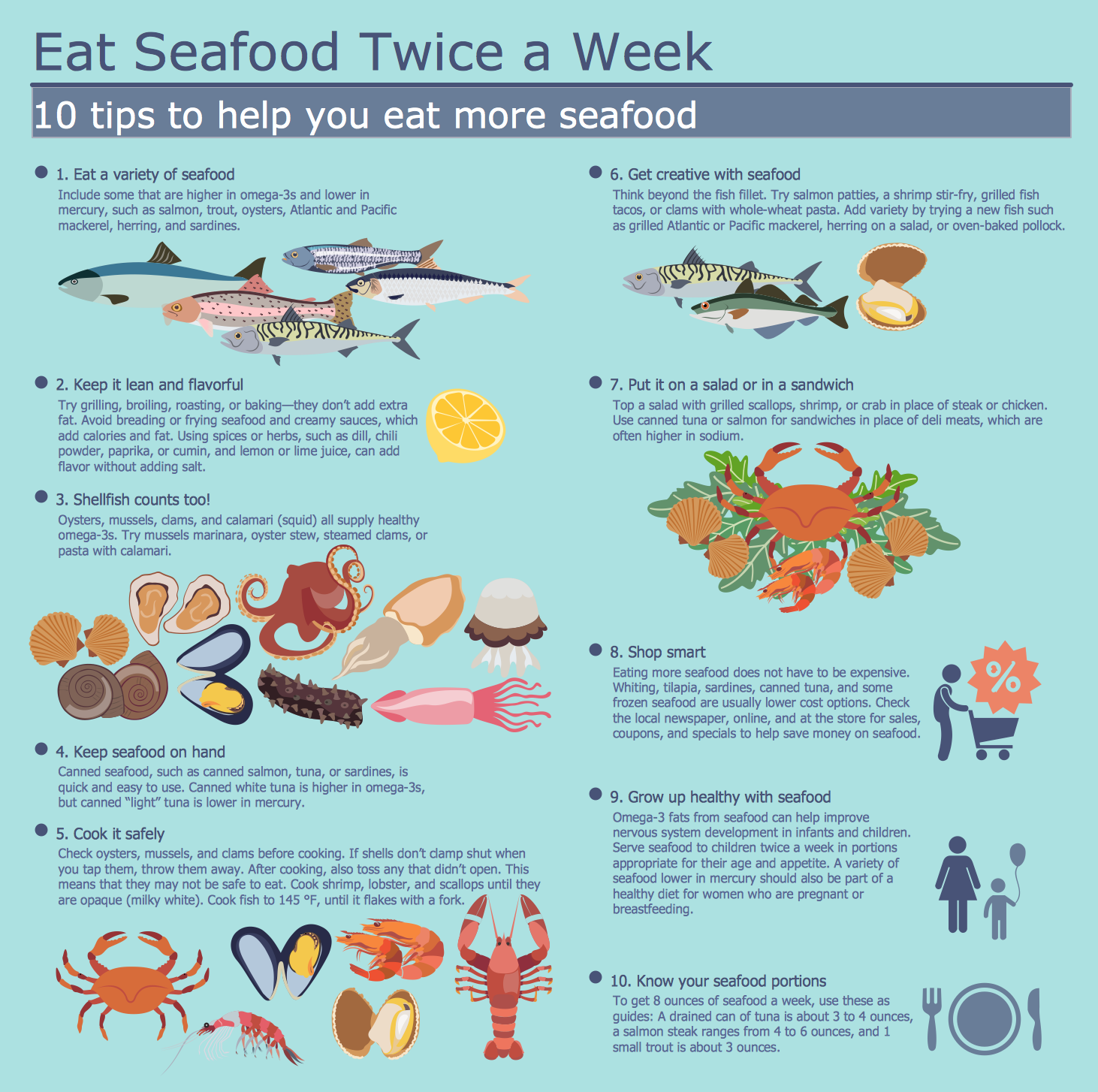 While drawing the great-looking colorful infographics, as well as the attractive illustrations that depict the benefits of a healthy diet, a large collection of vector graphic libraries of healthy foods’ symbols for vegetables, fruits, herbs, nuts, seafood, meat, dairy foods, drinks and beans from this solution can be used.