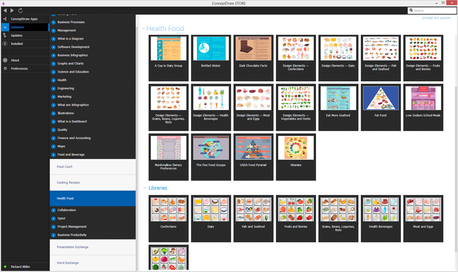 First of all, make sure that both ConceptDraw STORE and ConceptDraw DIAGRAM applications are downloaded and installed on your computer. Next, install the Health Food solution from the ConceptDraw STORE to use it in the ConceptDraw DIAGRAM application.