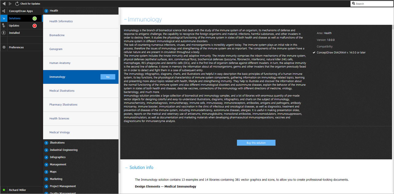 After ConceptDraw DIAGRAM is installed, the Immunology solution can be purchased either from the Health area of ConceptDraw STORE itself or from our online store. Thus, you will be able to use the Immunology solution straight after.