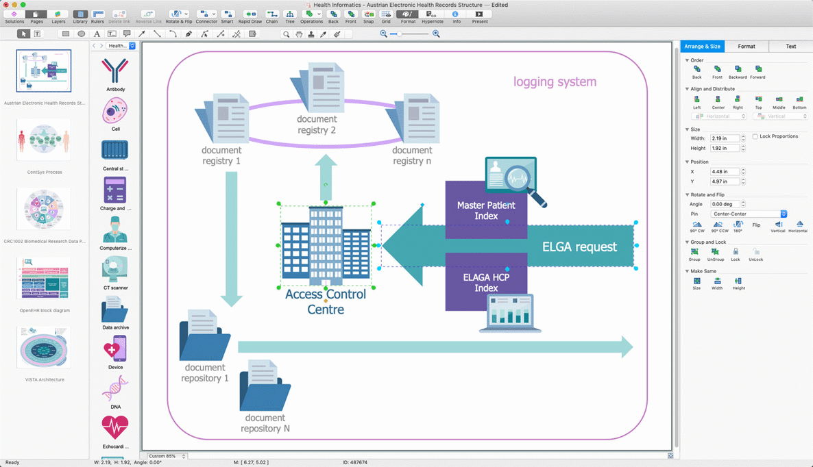 Health Informatics solution supplies the ConceptDraw DIAGRAM with tools and functionalities in a field of healthcare design and healthcare informatics. Including collection of professionally designed samples and a lot of high-quality health informatics vector design objects, it is the best for designing diagrams, schematics, flow charts, workflow charts, block diagrams, infographics, illustrations, and presentations slides in a field of Health Informatics, representing the newest medical information technologies, architectures of healthcare systems, principles of work of the specialized software, structures of health records systems, medical researches processes. It is the best for use by any medical workers, medical and statistic specialists, medical consultants, professors of medical sciences and lecturers in medical institutions, specialists of medical management, biologists, microbiologists, biotechnologists, highly specialized software specialists, and many other people of healthcare-related specialties.