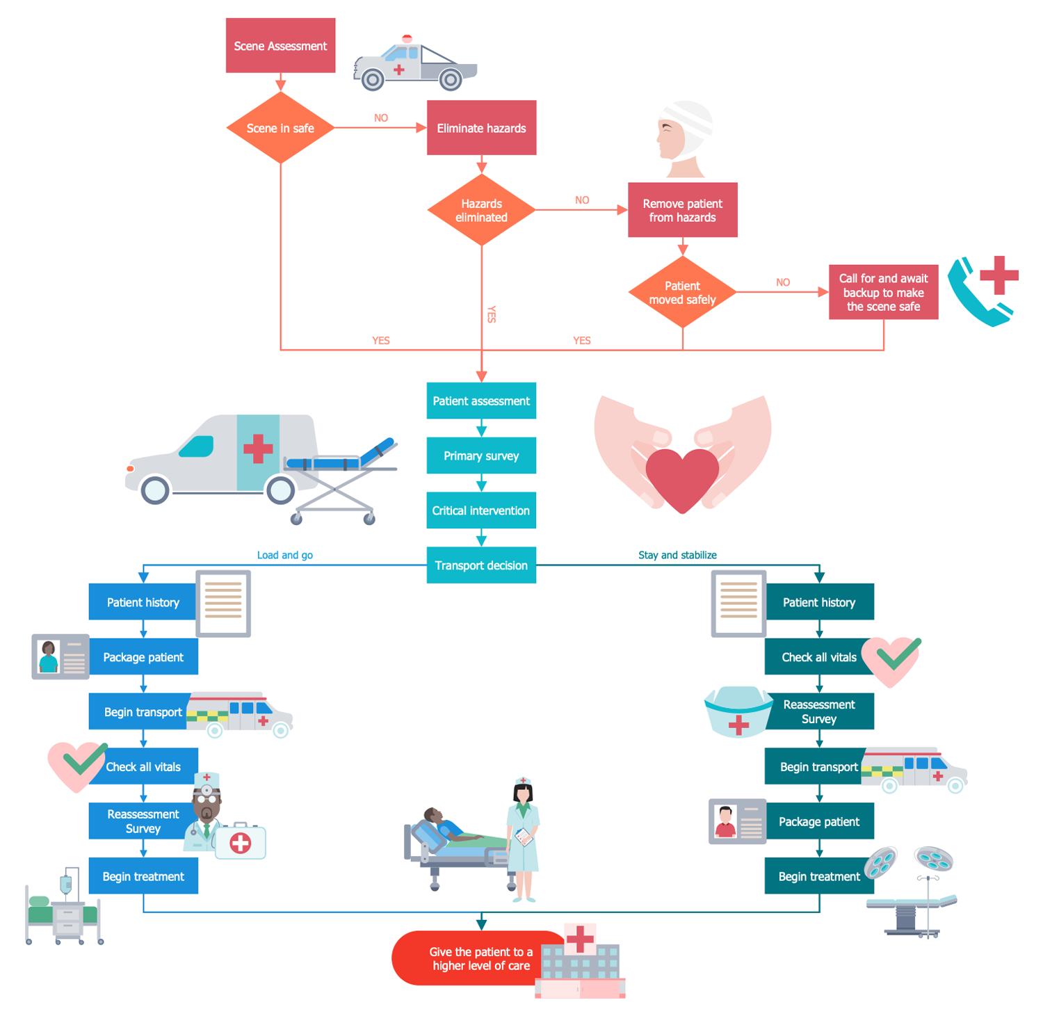 Huge number of instructions and algorithms for diagnosis, treatment and prevention of various illnesses, ailments, diseases, syndromes, and other disorders, are used in medicine and medical practice. They are compiled and presented in textual form or in graphical using the block diagrams, flowcharts and workflow diagrams. The health and medical flowcharts are widespread in medicine because they are the most comfortable and visual way to display the processes occurring in the human body in a given situation, the sequence of actions of the medical workers to eliminate particular health problems of the patient. The block diagram is the best way to turn a complex medical algorithm in a convenient and transparent scheme, providing speed and ease of understanding by any person. For all its simplicity and clarity, the workflow and block diagrams allow to display the information in a complete form and with any level of detail, even in the case of fairly complex medical algorithms.