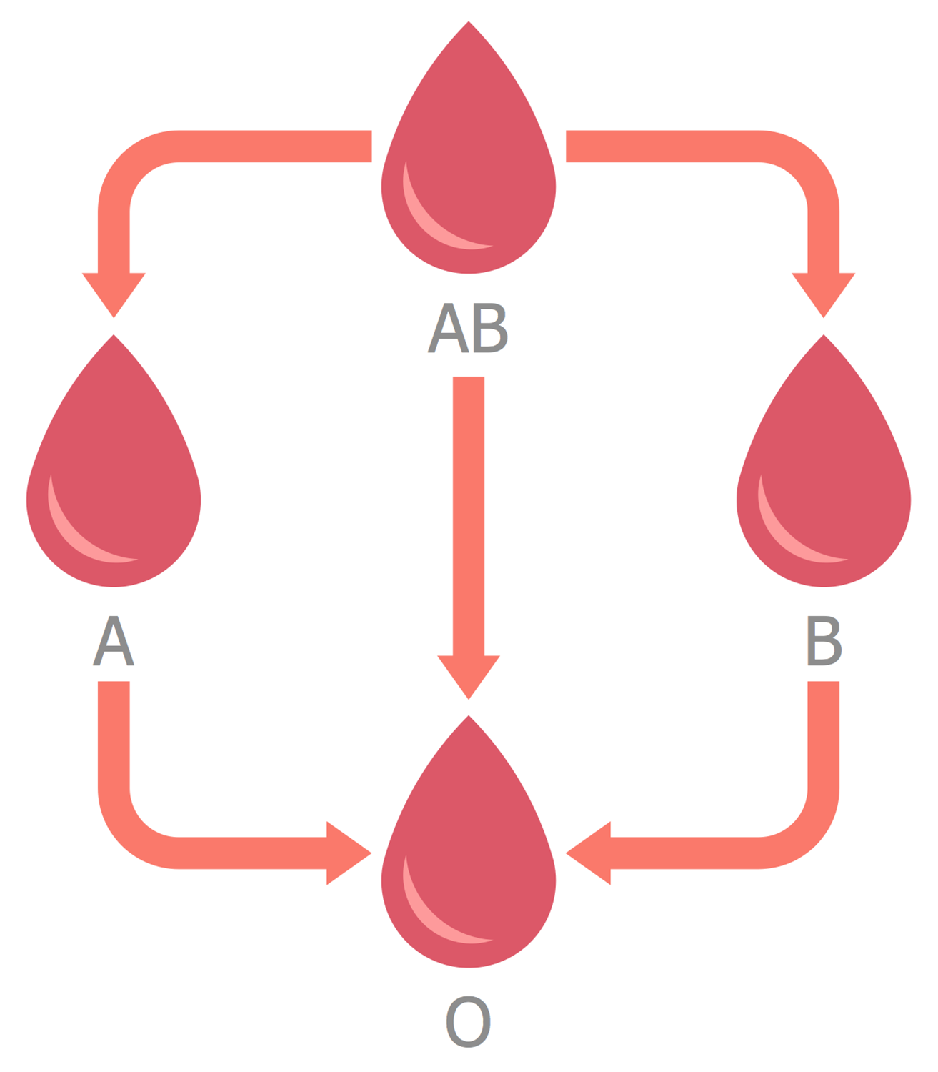 This Health diagram sample illustrates the compatibility path during plasma donation. The agglutination of erythrocytes at the plasma transfusion occurs when the donor's plasma contains the antibodies to antigens of recipient's erythrocytes. So, at the human plasma cannot be the antibodies to antigens on own erythrocytes, else they will agglutinate, but obligatory are contained the antibodies to antigens which are no at own erythrocytes. The plasma of donor with blood group IV(AB) contains the antigens A and B of erythrocytes, and has no antibodies to both antigens A and B, so it can be transfused to recipients of any blood group; at the donor's plasma with blood group II(A) are the antigens A and antibodies to antigens B; at donor's plasma of blood group III(B) are the antigens B and antibodies to antigens A; and the donor's plasma with blood group I(O) contains the antibodies to antigens A and B, and both antigens are absent, thus it cannot be transfused to recipients with groups II(A), III(B) and IV(AB), and can be transfused only to recipients with group I(0).