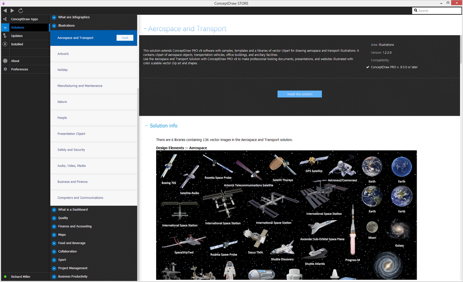 There are 6 libraries containing 136 vector images in the Aerospace and Transport solution.